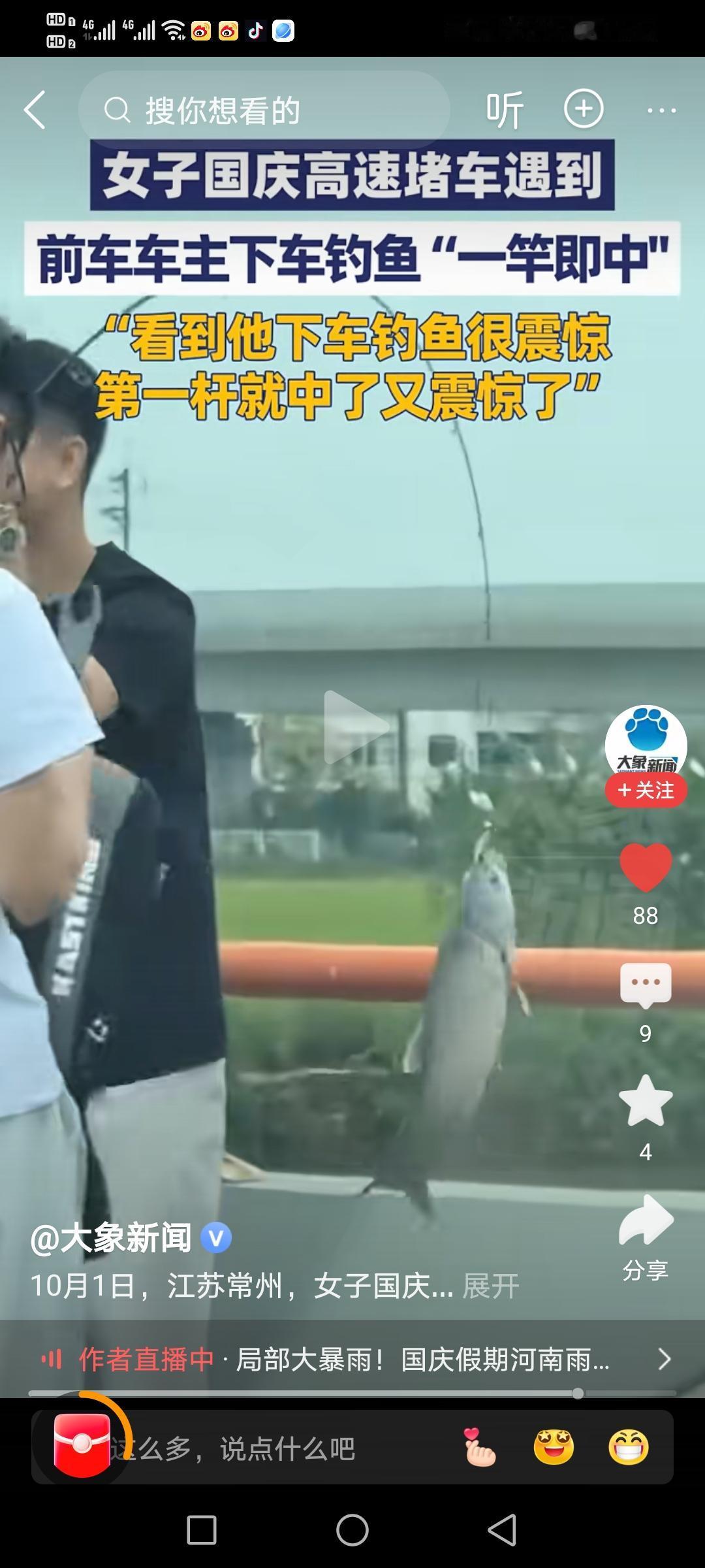 江苏常州,高速上堵车,没想到,小伙下车钓鱼一杆中。他激动说:“三年了,都没怎么
