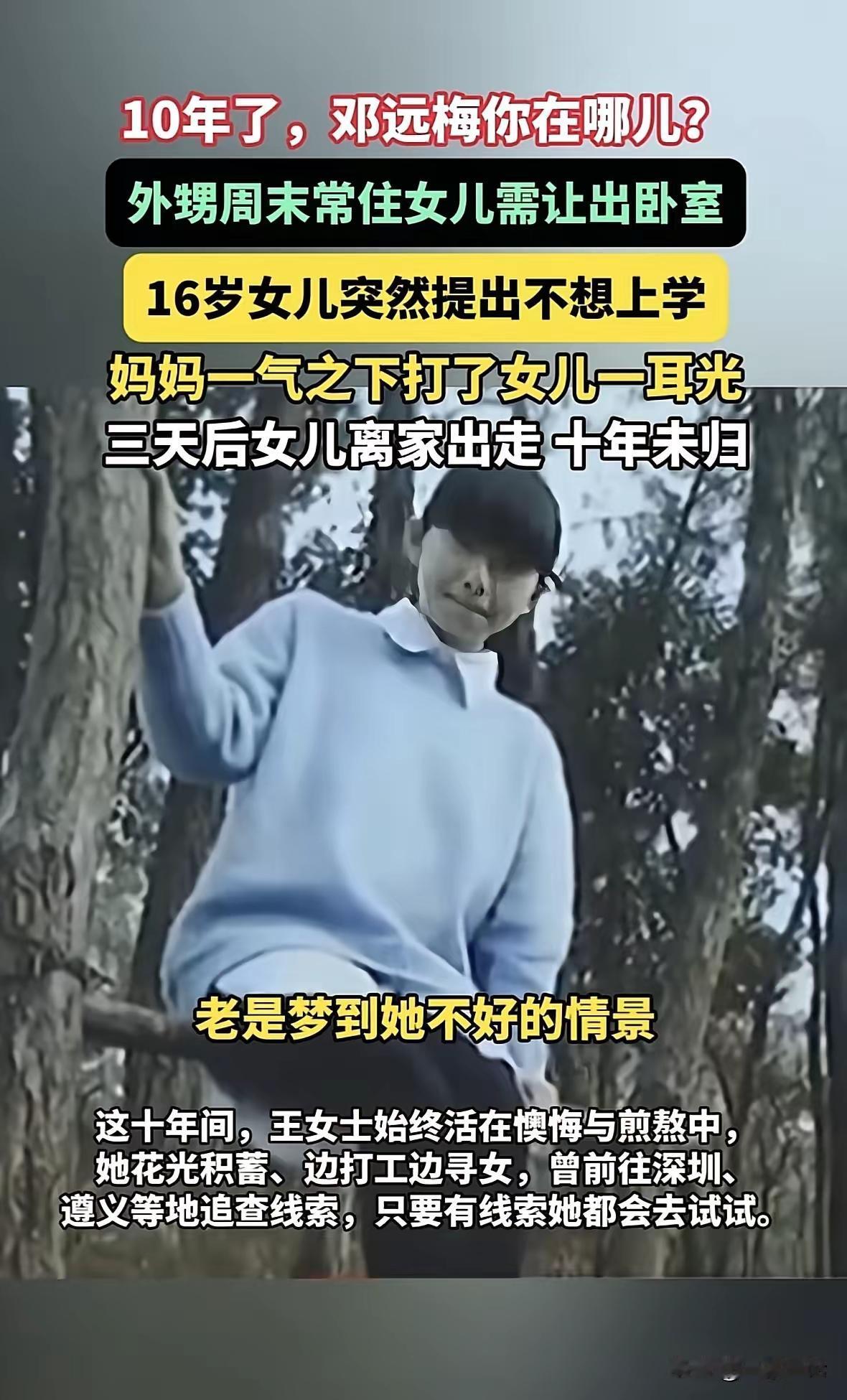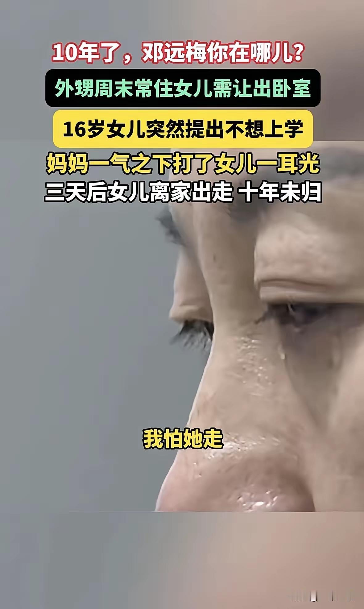 重庆,女子离婚后带着闺女住在一间小房子里,她让上学的外甥到了周末就来她家住,每次外甥一来,女子都让闺女把房间让出来,搞得闺女只能睡客厅,久而久之,闺女觉得妈妈太偏心,就闹情绪,还提出不想再上学,女子追问原因未果,抬手就给了闺女一巴掌,没想到,闺女因此离家出走,一走就是10年,至今未归,女子每天都在懊悔中度过。 信源:浙江警视 2025-10-1 网友评论: 让外甥来小小的家里住,一是让女儿与母亲住在一起,另外一个办法,让外甥住客厅里,作为母亲为什么不为十六岁的女孩子考虑一下,是否方不方便的问题呢? 难怪这女人离婚,本来房子就小,还让外甥每个星期都来住,让女儿挪地方,是可忍孰不可忍 有句话:外甥狗吃了就走,亲生的女儿不如个外甥,怎么想的?一巴掌打没了亲情、凉了心。可怜之人必有可恨之处。 女孩大了才要住房间,外甥男孩住客厅咋了本就是客,你还打叛逆期女儿,这孩子没身份证这么多年咋整 女儿可怜,让人心疼,这个妈妈不值得可怜。自作孽,不可活