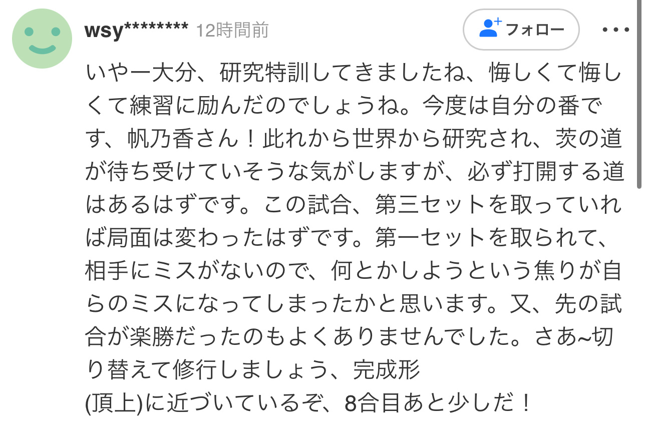 评论4:哎呀,对手显然下了很大功夫研究和特训,估计是因为懊悔不已,所以才拼命训练的吧。下一次就轮到你了,帆乃香!接下来全世界都会研究你,前方可能是一条布满荆棘的道路,但一定会有突破的办法。