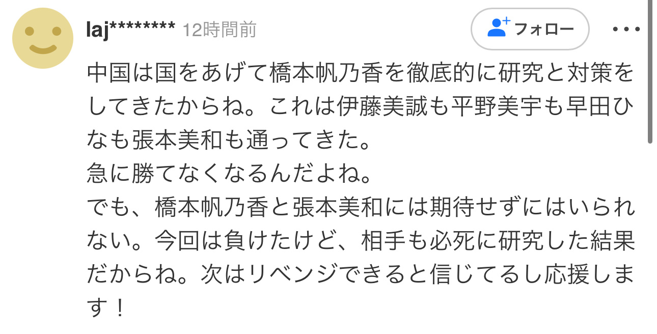 不过,人们还是忍不住对桥本帆乃香和张本美和抱有期待。虽然这次输了,但那也是因为对手拼命研究后的结果。我相信下一次一定能够复仇,我会继续为她们加油!
