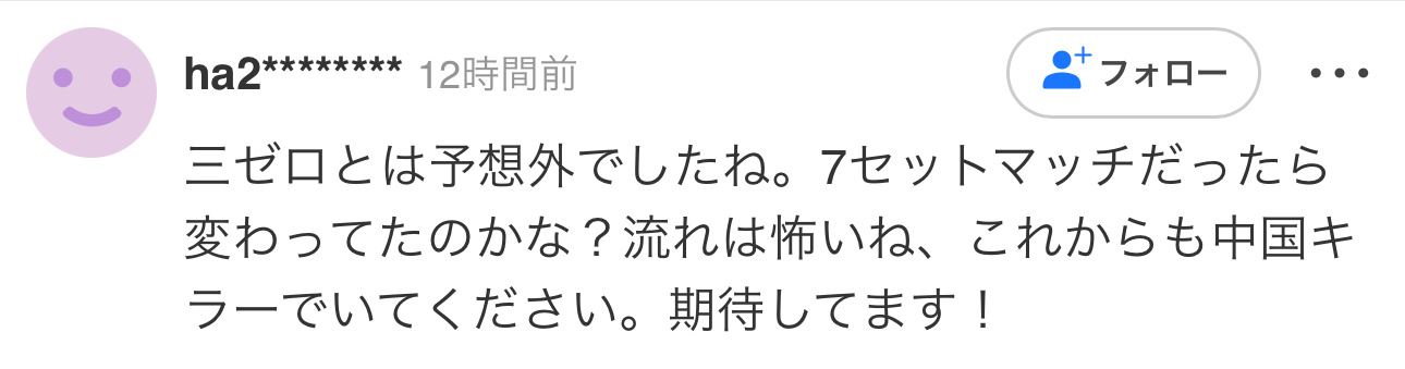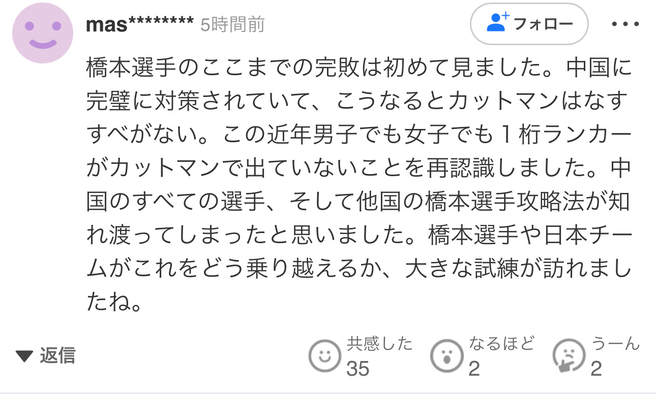 评论8:这是我第一次看到桥本选手被如此彻底地完败。中国队做了完全针对性的准备,这种情况下,削球手几乎无计可施。近几年,无论男女,前十名的选手中很少有削球手出战,这一点再次让我印象深刻。我觉得中国所有选手,以及其他国家的选手,对桥本选手的攻略方法已经被广泛掌握了。桥本选手和日本队如何应对这一挑战,将迎来一场巨大的考验。