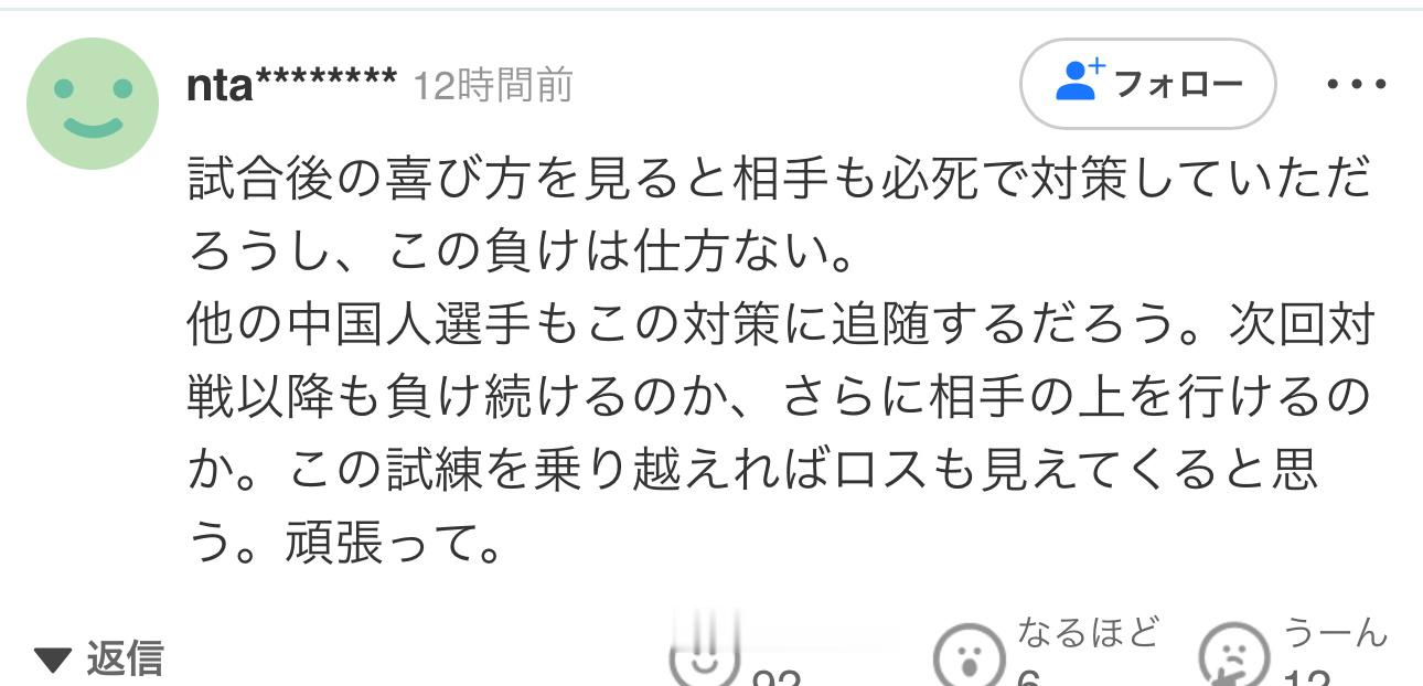 评论3:从赛后她的喜悦反应来看,对手肯定也是拼命做了针对性的准备,这场失利也是没办法的事。其他中国选手大概也会跟进采用类似的对策。接下来交手时,是会持续失利,还是能超越对手,就看她能否突破了。如果能跨过这一道试炼,我想前方的收获也会逐渐显现。加油。