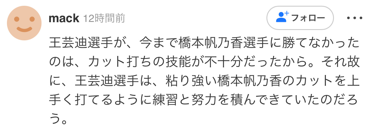 评论6:王艺迪之所以一直赢不了桥本帆乃香,是因为她对削球的应对技术还不够成熟。正因如此,王艺迪应该一直在刻苦训练,不断努力提升自己对桥本帆乃香这种顽强削球的应对能力。