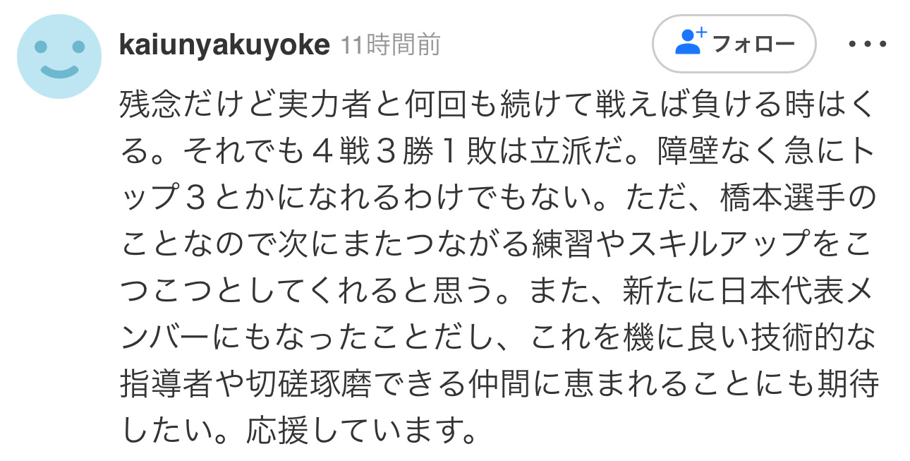 评论2:遗憾的是,但凡和实力强劲的选手连续多次交手,总会有输球的时候。即便如此,四战三胜一负的成绩已经很了不起了。没有人能毫无阻碍地一下子就跻身世界前三。只是,以桥本选手的性格,我相信她一定会踏实地把这次经验转化为下一步的练习和技术提升。再加上她也刚刚成为新的日本国家队成员,希望借此契机能遇到优秀的技术指导者,以及能够相互切磋的队友。一直为她加油。