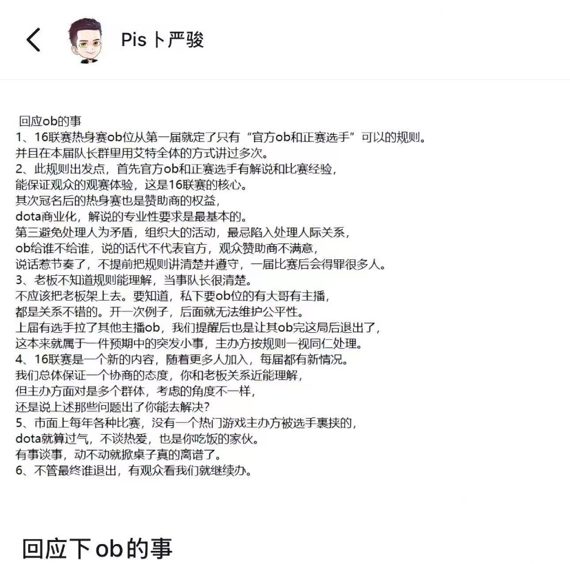 最近国内dota1圈子又撕逼了,起因是一些出钱办比赛的老板想进主机观战,但根据规定只有裁判和官方人员才能进到ob位,所以赛事主办方16平台拒绝了老板们的要求,结果部分主播以罢赛为要挟非要让直播间金主进ob位,事情闹大后pis也亲自出来回应说不可能为老板开这个先例的否则各方权益都会受影响,所以哪怕老板生气撤资不赞助了或是队伍退赛也不能坏了这个规矩