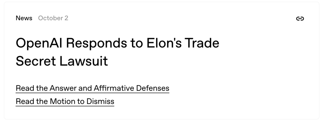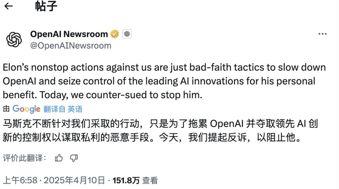 4月,OpenAI也曾发布声明表示对马斯克提起反诉,称马斯克针对OpenAI的行为只是为了拖累OpenAI以谋取私利的恶意手段。