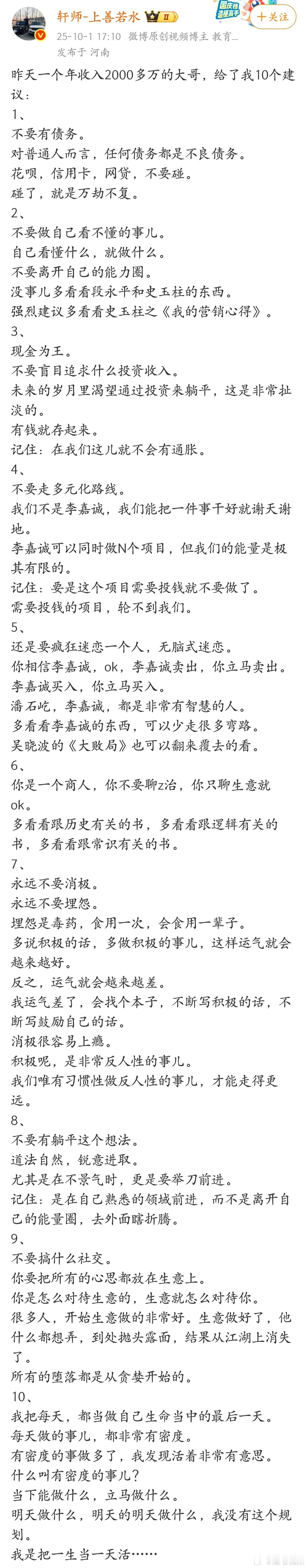 年收入2000多万的大哥,讲了关于人生发展的10个建议。