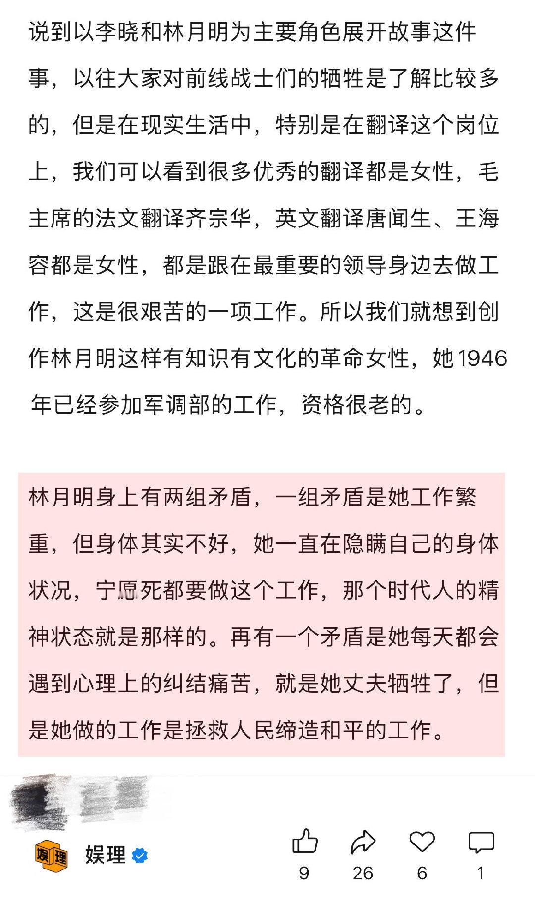 陈凯歌说没想到张子枫从艺16年了 陈凯歌谈战争中的女性力量 谈及《志愿军:浴血和平》中的女性角色李晓、林月明,陈凯歌导演直言这两个都非常重要的角色,“李晓(张子枫饰)是逐渐成长起来的,到第三部就可以挑大梁了,可以续接林月明队长的任务继续往下走。”宋佳饰演的林月明资格非常老,是有知识有文化的革命女性,“我们可以看到很多优秀的翻译都是女性,这是很艰苦的一项工作。”娱理独家↓