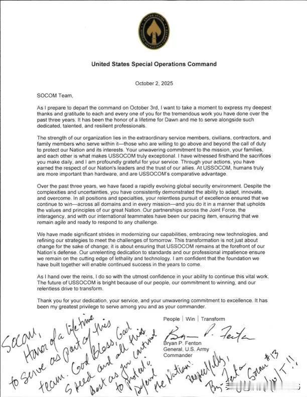 突发新闻:美国特种作战司令部司令布莱恩·芬顿将军签署了离职信