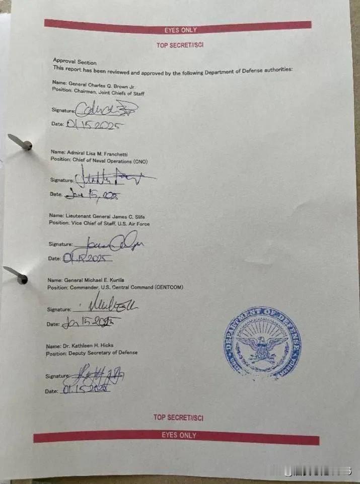据报道,美国国防部高度机密文件(日期为2025年1月)大规模泄露。虽然其真实性尚未得到证实,但声称拥有这些文件的Telegram频道“中东观察家”(Middle East Spectator)出于法律原因仅公布了封面。 这些文件上有美国前高级国防官员的签名,其中包括参谋长联席会议主席查尔斯·Q·布朗将军、海军作战部长丽莎·玛丽·弗兰凯蒂上将、空军副参谋长詹姆斯·C·斯莱夫中将、美国中央司令部(CENTCOM)司令迈克尔·E·库里拉将军和国防部副部长凯瑟琳·H·希克斯博士。 据称,泄露的文件包括数十份文件,涉及美国战略政策、俄罗斯和美国武器系统的细节、北约在乌克兰的态势以及美国在亚太地区的军事基地。