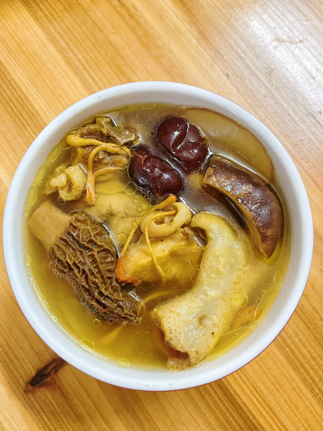 自家养的鸡,煮的汤色金黄超浓郁,鸡肉炖得软烂脱骨,羊肚菌吸饱汤汁绝了!下班快速喝上靓汤真幸福~