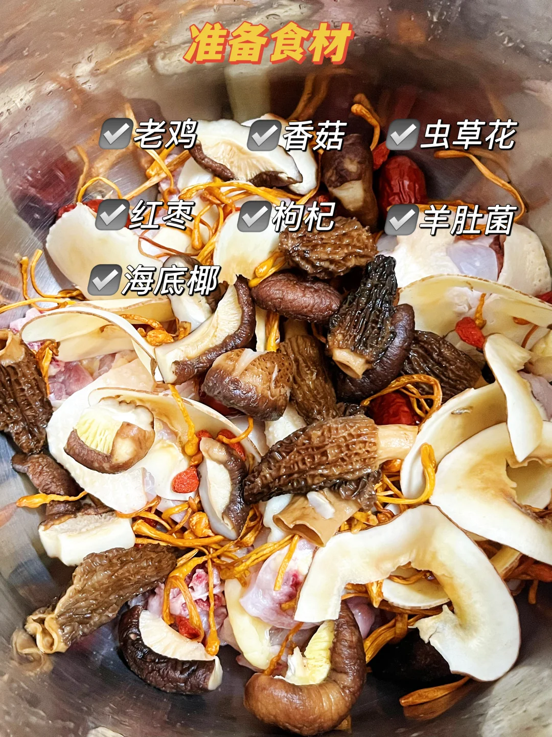 老鸡、香菇、红枣、羊肚菌、虫草花、枸杞、海底椰
