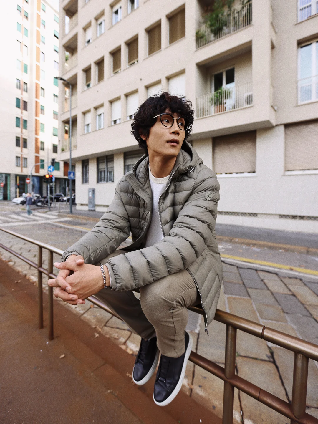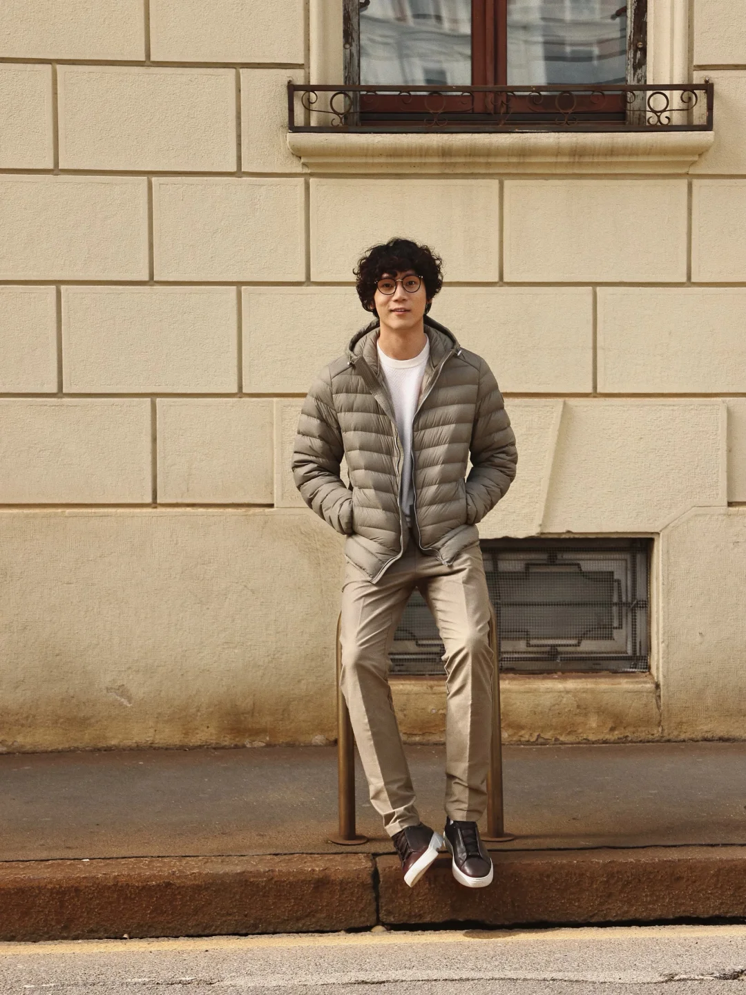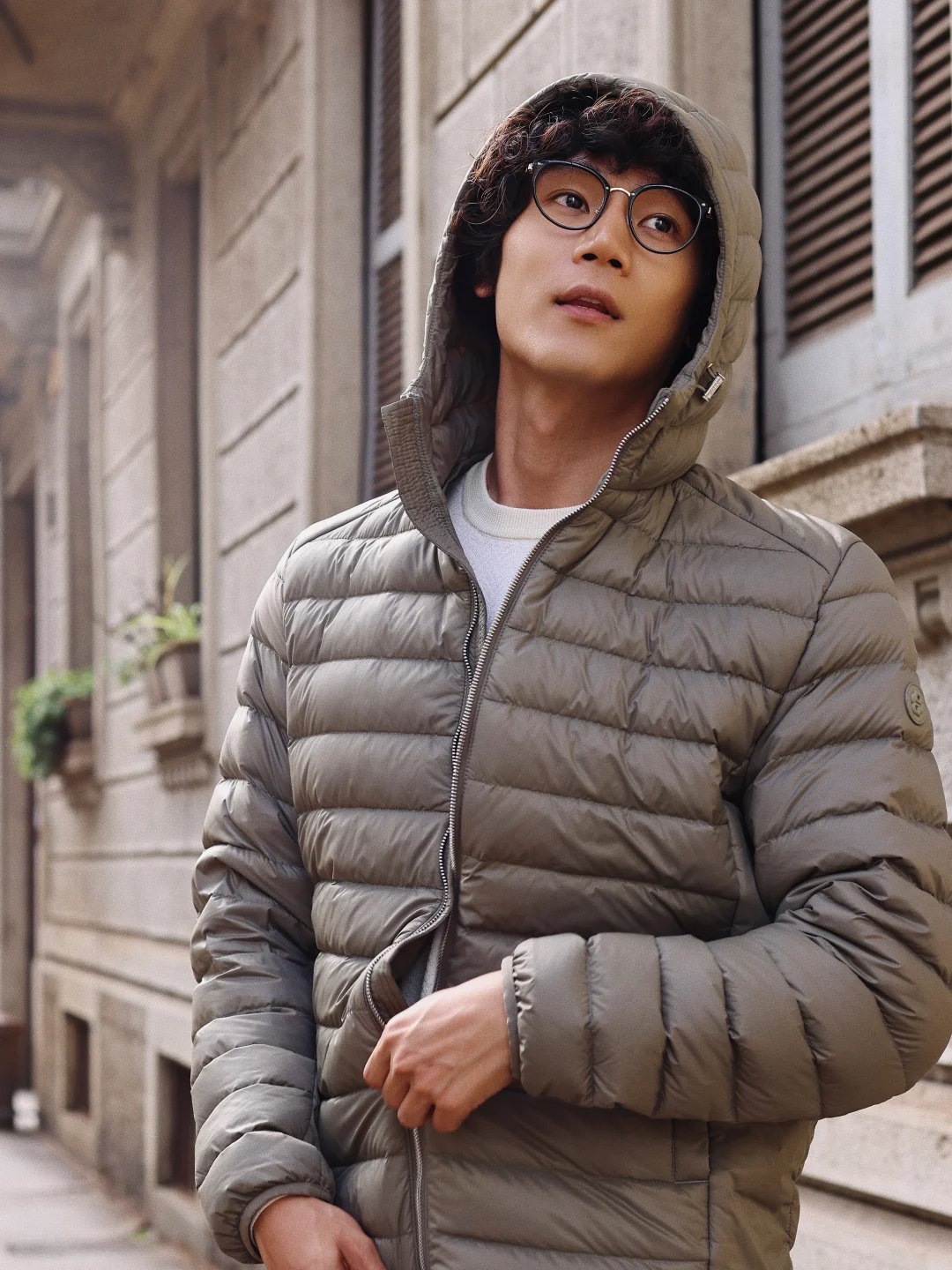而且我身上这款轻薄羽绒服非常适合城市漫游的主题