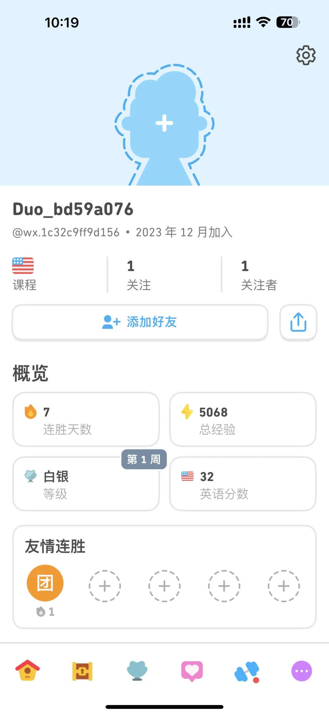 既然下定了决心,自然要为这场春天的约定多做些准备。我重新打开了多邻国——这个曾被我搁置的学习软件,如今成了每天的“固定功课”。从最初找回语感的生涩,到现在能流畅完成每日任务,不知不觉已连续打卡7天。看着界面上32分的成绩、白银等级的标识,还有攒下的五千多经验值,心里满是细碎的成就感。这不是什么耀眼的分数,却是我为纽约课堂铺下的每一步小台阶,每多学一个短语、多练一段对话,都让我对未来多一分底气。