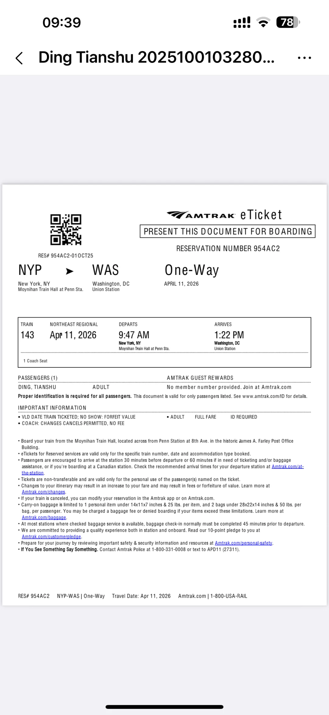 于是又立刻查起从纽约到华盛顿的交通方式,发现坐火车最方便,全程只要三个多小时,查攻略时看到有人说火车票“越早买越便宜”,想着现在距离3月还有段时间,正好是买票的好时机,便立刻对着攻略一步步操作,付完款看到订单成功的页面时,心里又多了一份踏实——连游学后的行程都安排妥当了,这场旅程仿佛已经在眼前清晰起来。