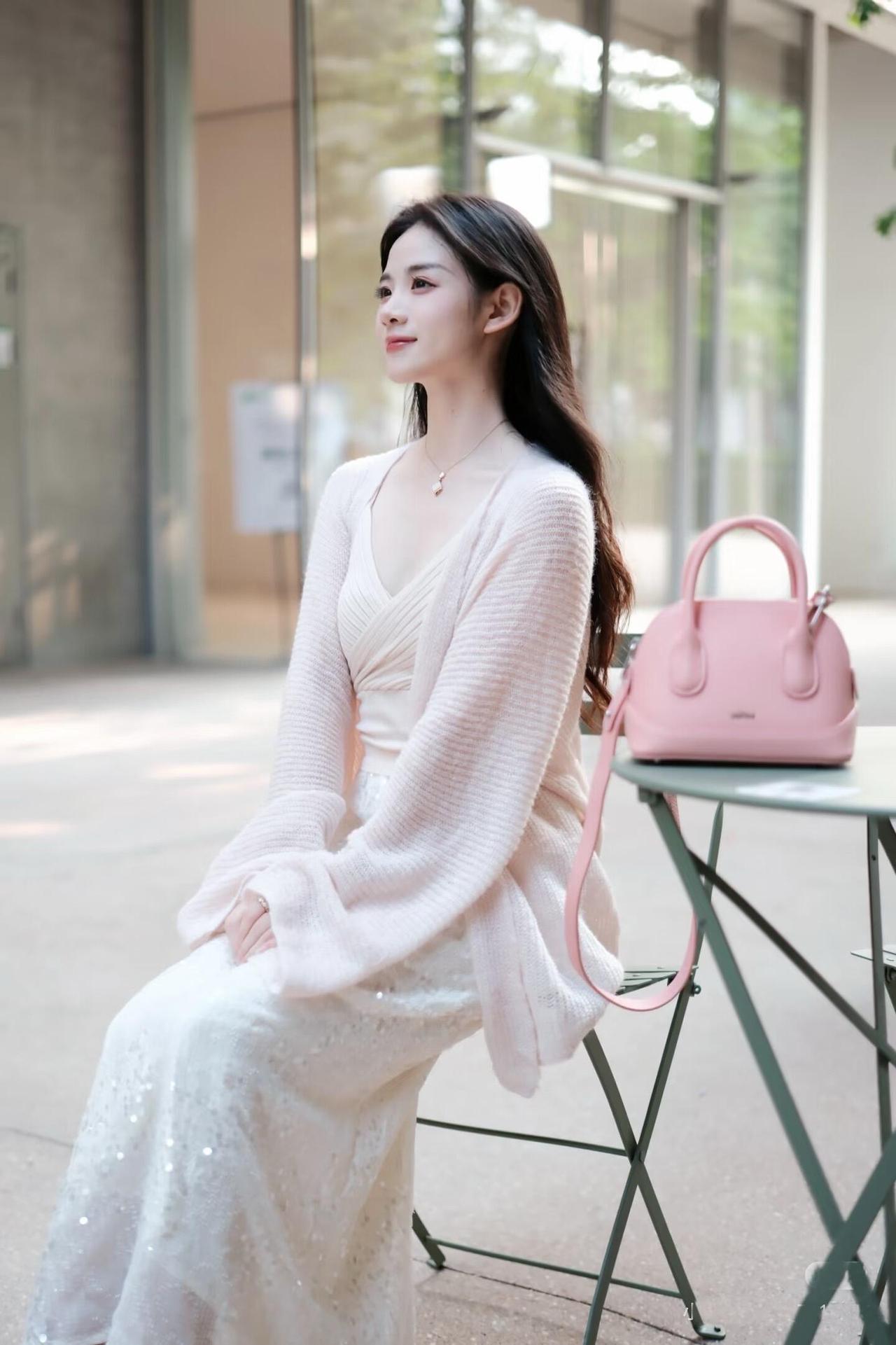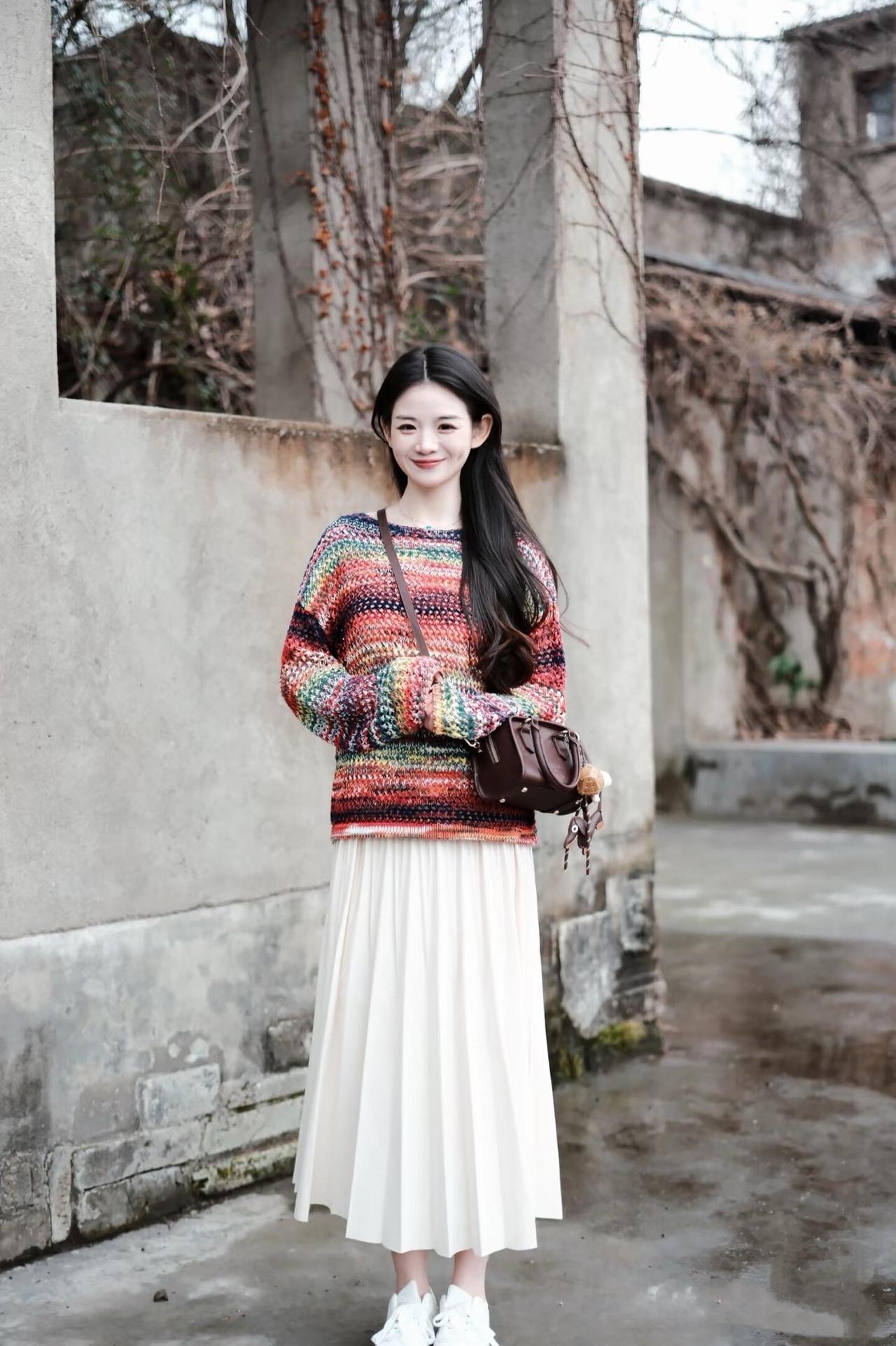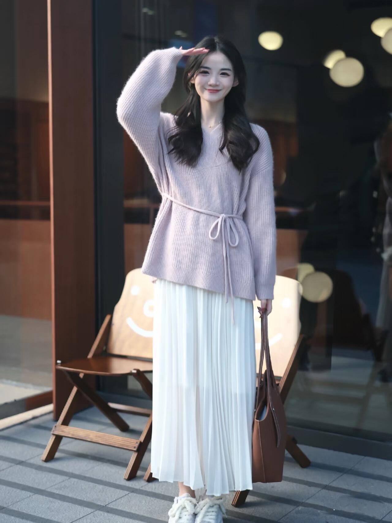 温柔冬日多款穿搭紫白相搭粉白色系穿搭 粉色毛衣搭配白色长裙