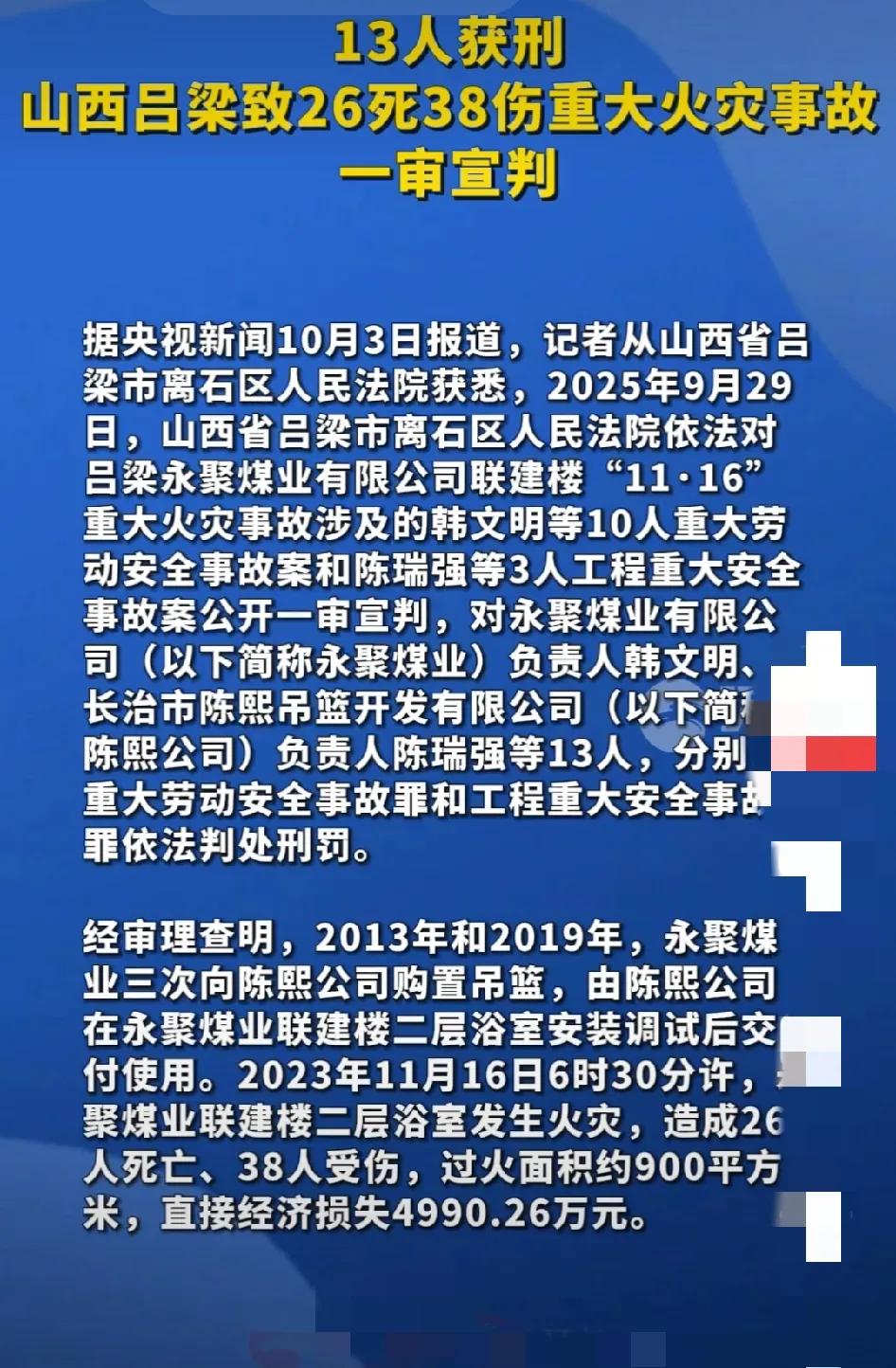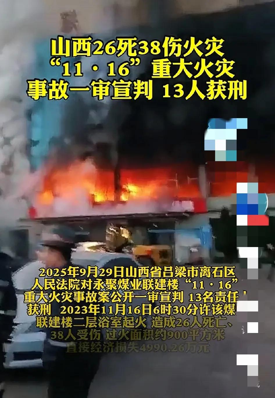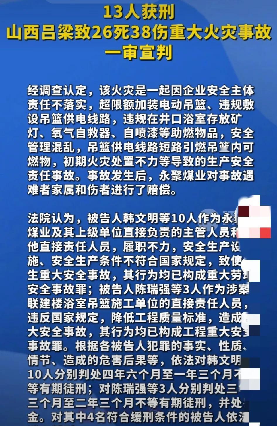 13人获刑 灾难都是天灾人祸引起的,天灾自然界灾害,我们正在努力改变;人祸都是人为引起的灾难,这么大的安全管理事故,我感觉好像判轻了些! 据报道,2023年11月16日,山西吕梁永聚煤业有限公司联建楼浴室发生重大火灾事故,造成26人死亡、38人受伤,直接经济损失4990.26万元。2025年9月29日,吕梁市离石区人民法院对事故涉及的13名责任人作出刑事判决: 首先,重大劳动安全事故罪:永聚煤业负责人韩文明等10人因未履行安全生产责任,被判处四年六个月至一年三个月有期徒刑; 其次,工程重大安全事故罪:施工方陈熙吊篮公司负责人陈瑞强等3人因施工质量不达标,被判处三年三个月至二年三个月有期徒刑。其中4人因符合缓刑条件被适用缓刑。 再有,事故由企业安全主体责任不落实、违规加装电动吊篮、线路短路引燃可燃物、初期处置不当等多重因素导致。法院认定涉事企业及施工单位均存在违反国家规定的行为。 另外,该案通过严格司法程序保障了被告人的诉讼权利,10名主要责任人当庭认罪服判。此判决体现了我国对安全生产违法行为的严厉打击态度,具有警示意义。