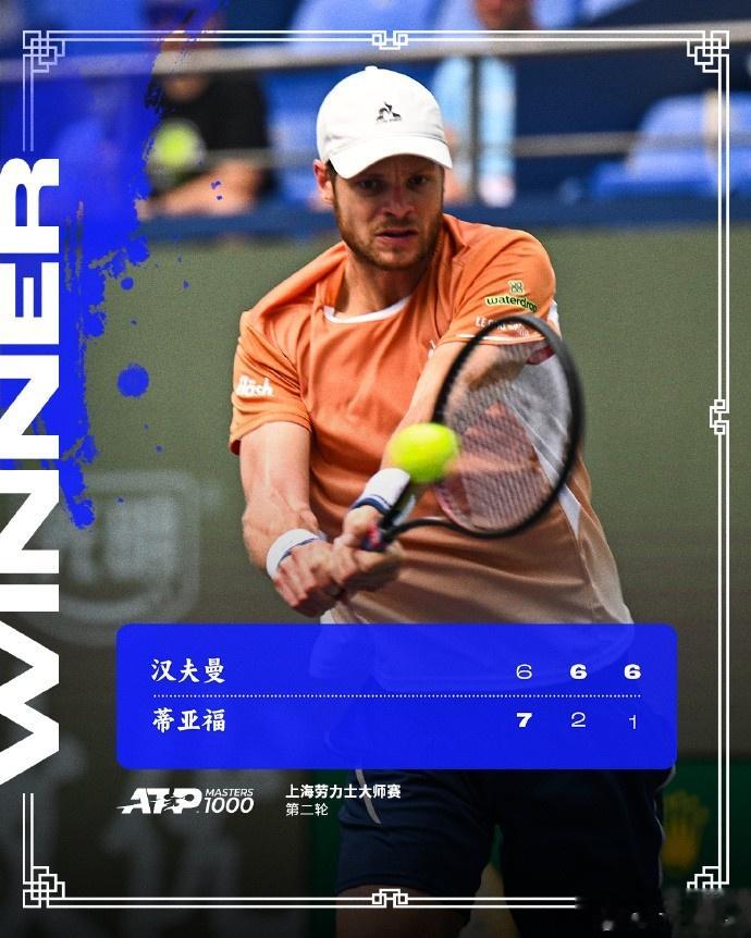 资格赛选手汉夫曼2-1逆转25号种子蒂亚福,晋级上海大师赛第三轮