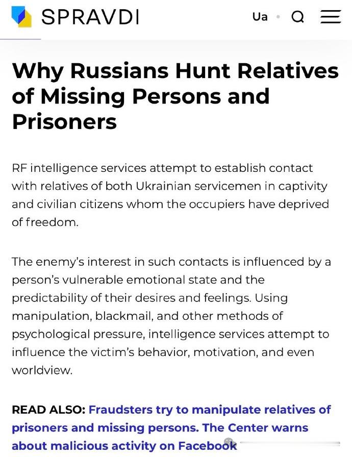 让人愤怒的是,俄罗斯情报部门还在利用饱受折磨的战俘家属,乌克兰战俘协调总部通过乌克兰战略通信和信息安全中心(SPRAVDI)表示,俄罗斯情报部门利用战俘家属的悲痛,试图招募他们进行破坏和宣传活动,目的是让这些战俘家属散布对乌克兰政府而不是俄罗斯的不满情绪,制造“斯德哥尔摩症候群”,破坏对乌克兰政府机构和彼此之间的信任,打击士气,扰乱动员并直接参与破坏。