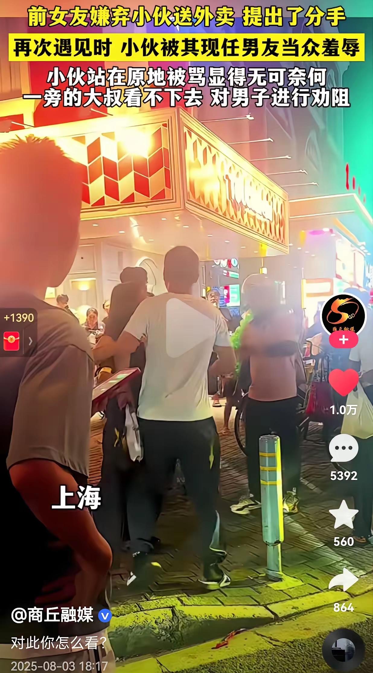 真的是杀人诛心呐!一女子嫌弃自己的男朋友是送外卖的,提出了分手。没想到再次相见时,小伙被其现任男友和前女友当众羞辱,小伙站在一旁被骂的无可奈何。一旁的大叔看不下去,对男子进行劝阻。没想到的是,男子依旧是不依不饶。网友:真的是“不是一家人,不进一家门。” 网友评论: “她的现任男友对小伙子也是冷嘲热讽,当众羞辱小伙子”,这小伙子太老实,其实他只要一句话:我吃过的剩饭剩菜香吗? 一句话就可以反杀的事情:我玩剩下的,你接的一手好盘!!祝你玩的开心!! 很多男的不值得同情,并不是说什么受害者有罪论 。年纪轻轻没点血性,怎么让人欣赏的来? 直接无视走掉,如果对方不让走。回怼,并且报警,对方寻衅滋事,限制他人自由。 这时不是应该来一个开着直升飞机的管家模样的人躬身说:少爷,老爷叫你回家继承家业! 别太欺负老实人,老实人的愤怒你去承受不起的。你连求饶的机会都没有!