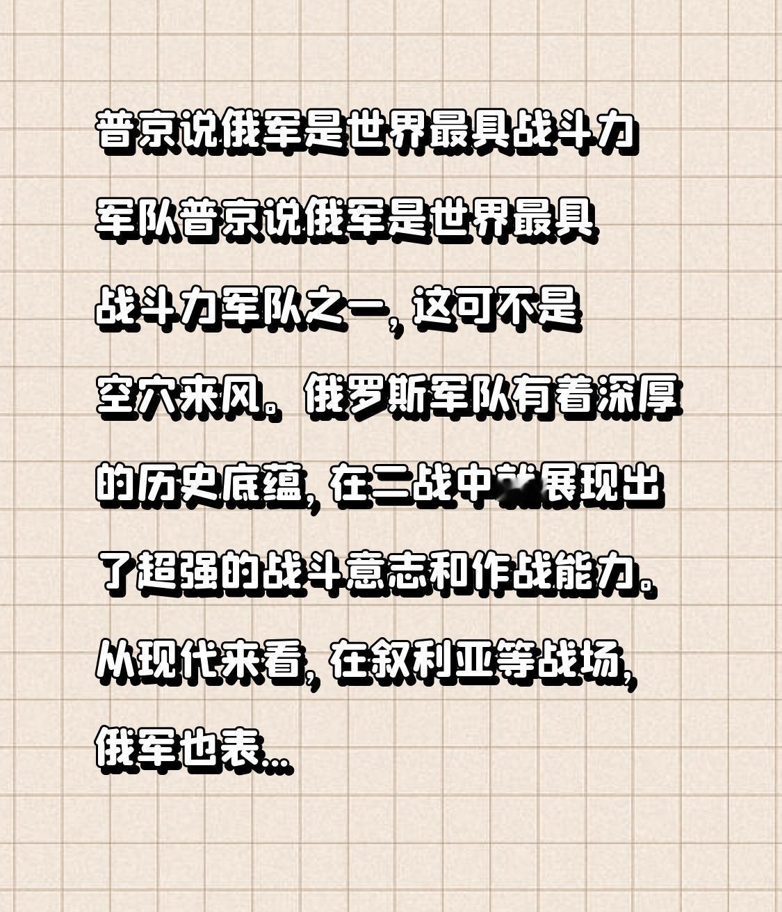 普京说俄军是世界最具战斗力军队普京大帝 俄罗斯之伟大 普京说俄军是世界最具战斗力军队之一,这可不是空穴来风。俄罗斯军队有着深厚的历史底蕴,在二战中就展现出了超强的战斗意志和作战能力。 从现代来看,在叙利亚等战场,俄军也表现出色。他们拥有先进的武器装备,像“匕首”高超音速导弹等,能对敌方目标进行精准打击。而且俄军士兵训练有素,战斗素养极高。北约借乌克兰士兵与俄作战,可俄军依旧能在复杂局势中应对自如,逐步发展壮大自身实力,说其是最具战斗力的军队之一,实至名归。