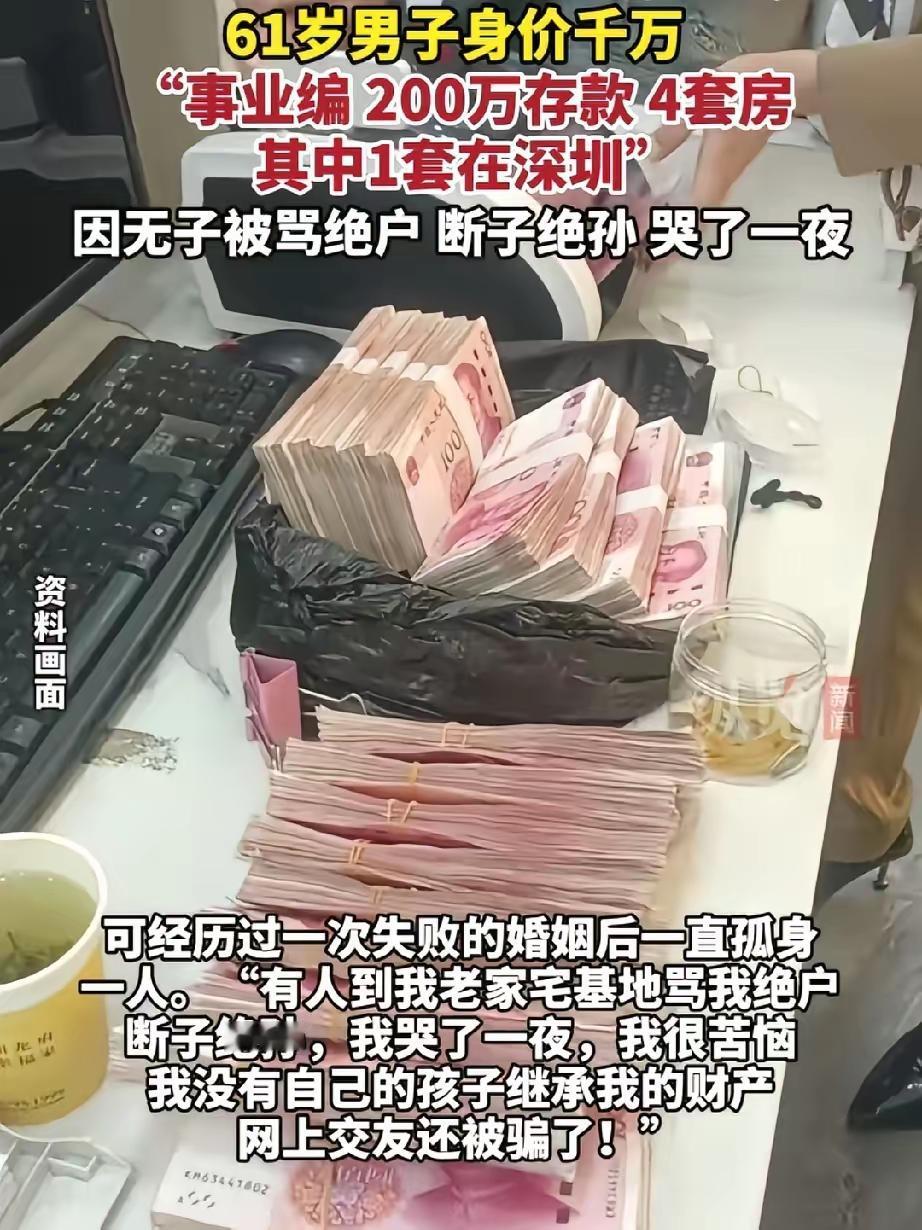 河南,一61岁男子苦恼自己拥有200万存款4套房其中一套在深圳,身价千万没人继承自己的产业,因无子女被骂绝户断子绝孙哭了一夜。 网友评论: 人这一生,不管你多有钱,都不如儿孙满堂,孩子才是每个人的希望,金山银山都不如人丁兴旺! 六十岁的男人还可以生育,赶紧找一个老婆,去农村找,给50万彩礼,随便找一个二十几岁的妹儿,在生个娃儿。如果,这个老婆生不了,再找二老婆,三老婆,四老婆。 个人觉得,他可以回家乡,把家乡的一些基础设施及环境完善一下,在投资一个合适的工厂,让附近乡亲们上个班,工厂法人就是政府,在剩点钱准备养老就好。 不孝为三,无后为大。年轻时只顾拼命挣钱,老了,想有后己来不及了。留给外甥,或侄儿吧。 人这一生,不管你多有钱,都不如儿孙满堂,孩子才是每个人的希望,金山银山都不如人丁兴旺!