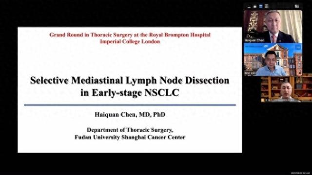 北京时间10月3日下午3点,复旦大学附属肿瘤医院胸外科主任陈海泉教授受邀在英国帝国理工学院附属皇家布朗普顿医院,在“线上大查房”环节分享了主题为:磨玻璃肺结节淋巴结清扫的“中国经验”。这也是陈海泉教授继两度登上“哈佛讲坛”后,再次受邀在国际顶尖医学中心分享中国肺癌专家的前沿创新成果,代表国际顶尖医学中心对中国胸外科领域学者和肺癌诊治“中国经验”的高度认可。