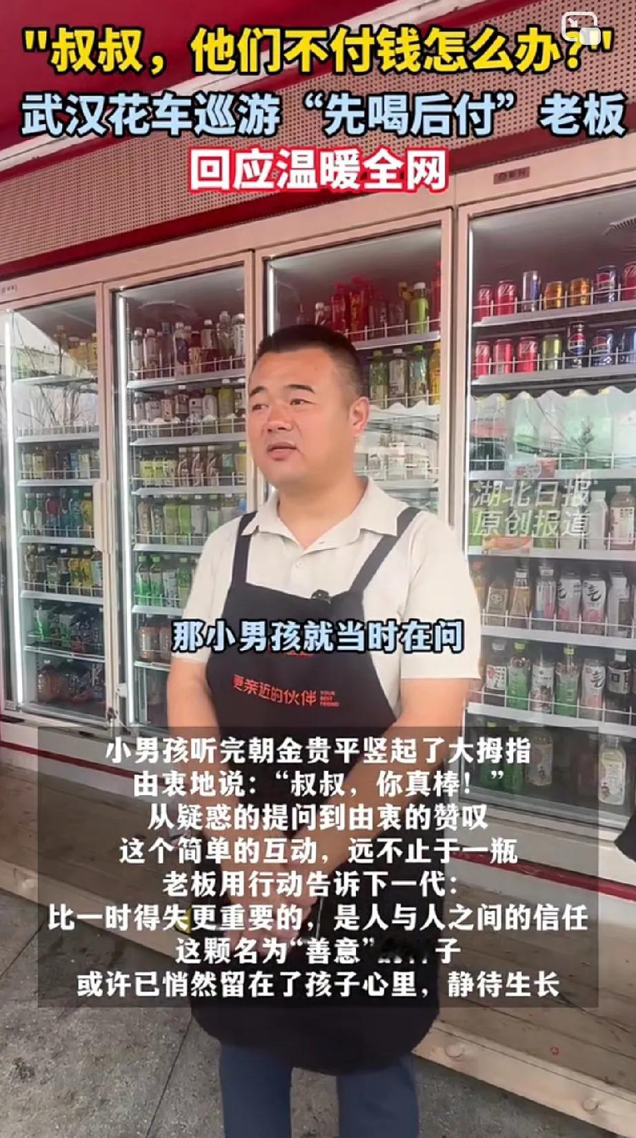 10月1日,武汉巡花车处无网络附近一店铺又消费者络绎不绝,而没现金的无法用手机扫码,店老板大声喊:先用后付,有网络才回来付款。 不一会一小孩也来买一瓶水,他对店老板说:你让ta们先拿东西去,如果ta们不回来付钱呢?你不就亏本了。 小孩这番话,店老板竖起大拇指。
