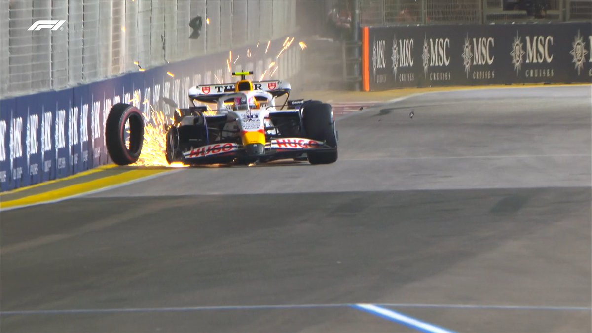 F1官方推特账号发推特报道,红旗利亚姆·劳森撞上护栏!他在维修区入口停下并离开赛车#F1#SingaporeGP