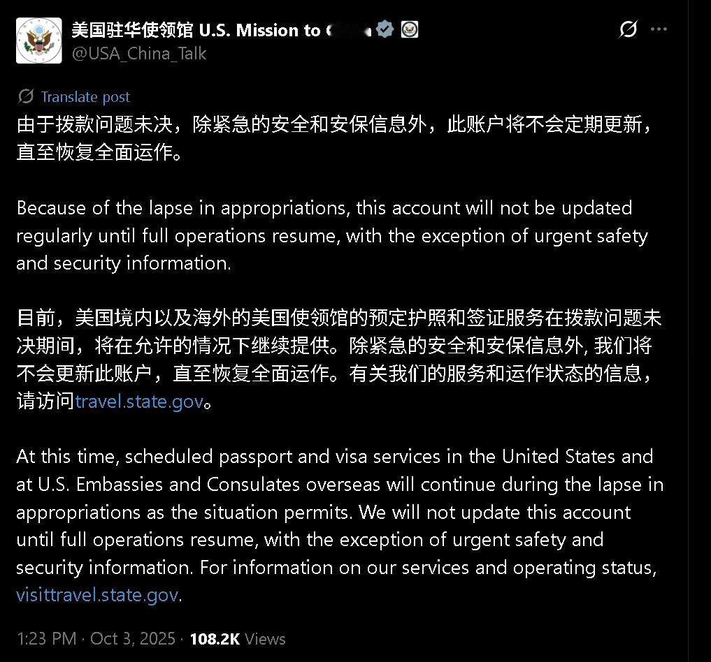 据香港文汇网、环球时报等多家媒体报道,美国驻华使领馆在X平台宣布,由于拨款问题未解决,除紧急的安全和安保信息外,美国驻华使馆在X平台的官方账户将不会定期更新,直至经费解决为止。美国驻华大使馆微博最新的内容是10月1日发布的庆祝中国国庆的贺信,该账户此前一般每天会更新好几条内容,这次连续两天没有更新的情况比较少见。微博账号是否会同步“断更”暂时无法知晓。