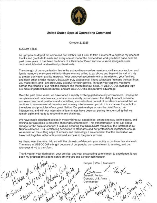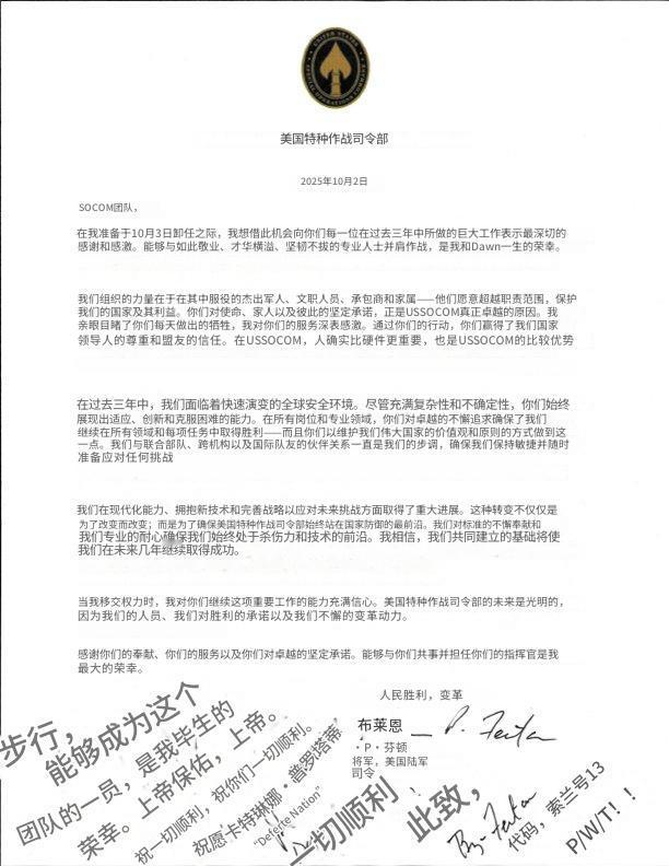 继美国空军全球打击司令部司令辞职后,美国陆军特种作战司令部司令也辞职了,美国国防部长赫格塞思的会议威力不小 当地时间10月2号,继美国空军全球打击司令部司令托马斯·布西耶尔之后,美国陆军特种作战司令部司令布莱恩·芬顿(Bryan Fenton)也发布了告别信,表示将在10月3号离任。在9月30号,特朗普在美军高层军官的紧急会议上曾称美国处于内部战争中,要求美军高层军官要为美国国内的战争做好准备,并表示要将芝加哥、旧金山、纽约、洛杉矶等当作练兵场。而美国特种作战司令部的职责就包括反恐和非常规战,布莱恩·芬顿此时离任或许与此有关。