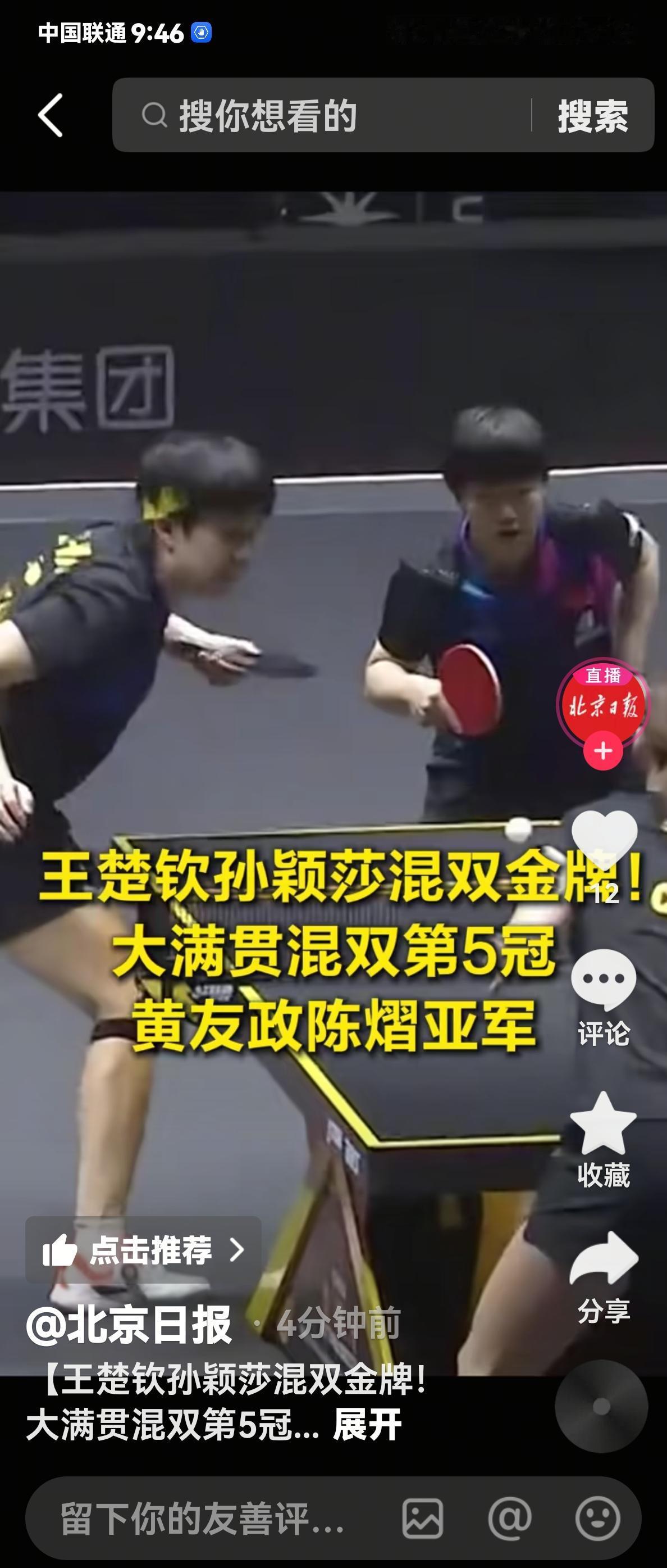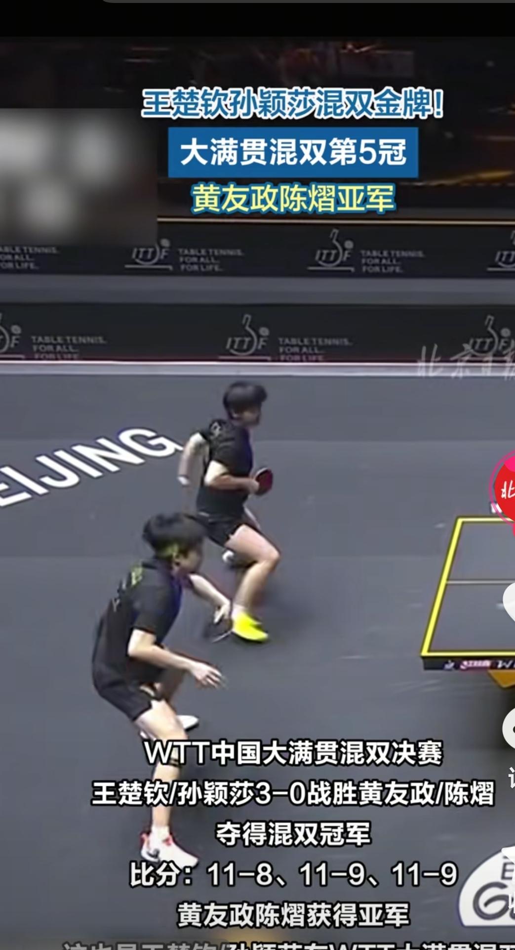 有人说新赛制下莎头组合将无缘混双总决赛, 简直是一派胡言。 莎头组合北京大满贯不出意料依然夺得冠军, 以无可辩驳的事实再次证明莎头组合,天下无双, 八年的配合,前无古人, 那种不说一语却抵千言万语的默契确实目前独一无二无人能及, 就连雨果和他女朋友都自愧不如,不能相提并论。 大头是幸运的, 遇到了莎莎, 开启了他的混双冠军之旅, 莎莎慧眼识珠, 选择了大头, 成就了彼此的辉煌人生。 有时候选择搭档犹如选择伴侣, 选对了就是一生一世, 你懂我的不易, 我理解你的心酸, 并肩作战,互相成就, 你追梦我陪伴, 我疲惫时你依靠, 最幸福的事莫过于在你身边, 你在身边。