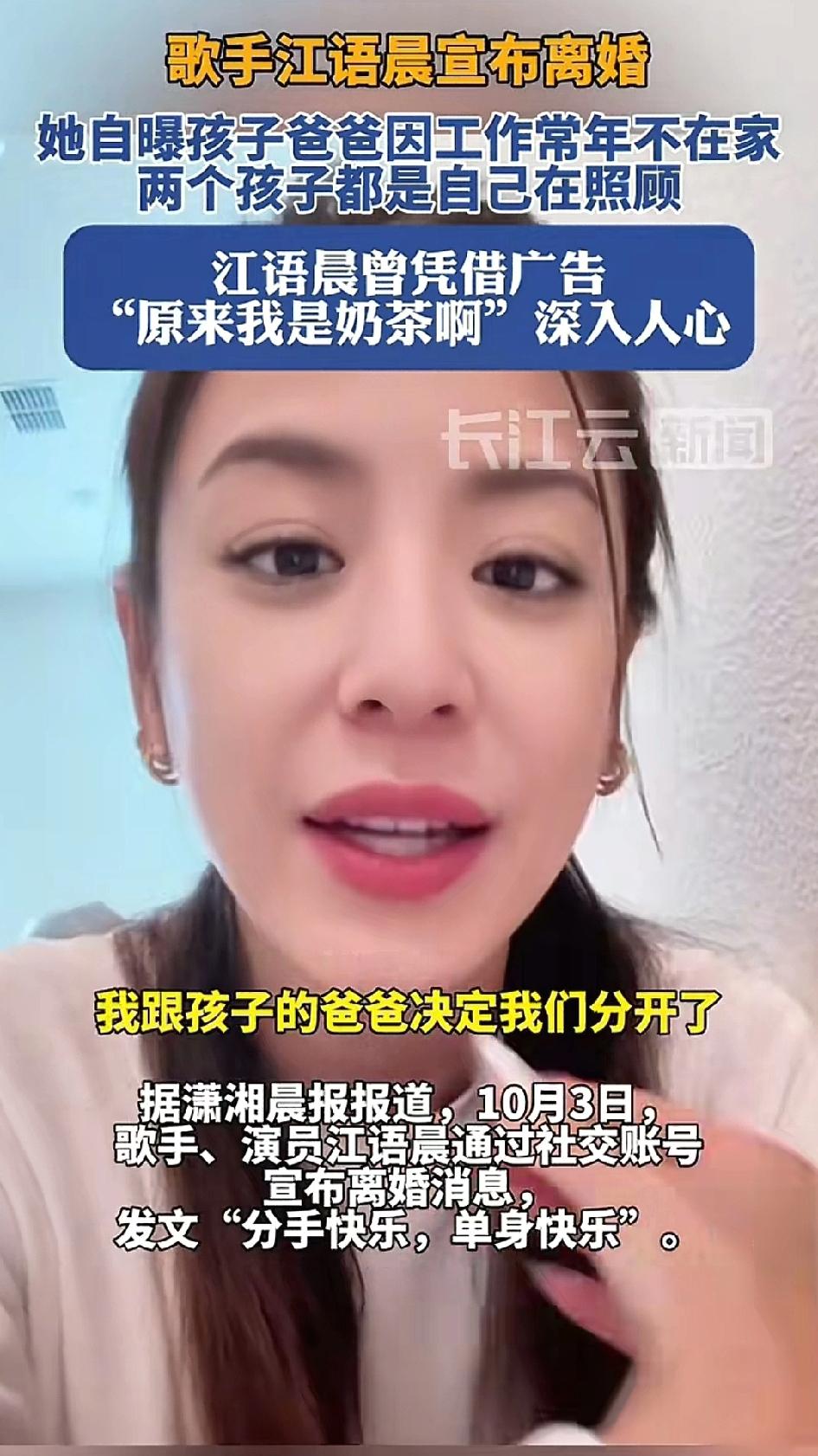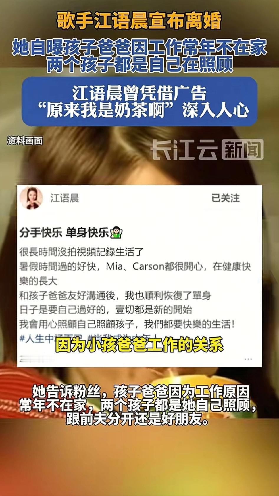2016年1月,歌手江语晨与美籍机师JoshAnderson 在拉斯维加斯结婚, 婚后育有一对混血儿女。9年后,江语晨宣布与美籍丈夫离婚,离婚理由是丈夫因工作常年不在家,两个孩子都是自己在照顾。从江语晨发布的相关信息来看,她与丈夫是友好交流之后决定离婚,离婚后,两人还是好朋友,她的生活也没有太大的改变,孩子还是江语晨在养,也就是说,丈夫并没有争孩子的抚养权,两人也没有财产纷争。 虽然这样说,“爸爸因工作原因常年不在家”,江语晨给出的这个离婚理由是很牵强的,但是很体面。众所周知,欧美人最在乎工作时间,工作时间超过一定限度就会起诉公司,或者美国公司内部的工会马上就与公司交涉,所以欧美人工作时间绝不可能超过每天八小时,而且保证双休以及各种假期。所谓“工作原因常年不在家”的理由,根本不成立。背后的原因不可能是江语晨“不爱丈夫了”,更多可能是“丈夫不爱江语晨”了,所以不回家。江语晨给了自己一个台阶下!也给她的外国老公一个体面的退出。
