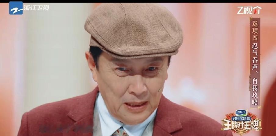 唐国强老师这回在《王牌对王牌》里真是演到咱心坎里去了! 看他在台上即兴演那个挨训的中年员工,对着老板金九粒一边陪笑一边点头哈腰,嘴角在笑可眼神里全是憋屈。这不就是咱们身边那些四十来岁的老大哥们嘛——家里房贷要还,孩子补习费等着交,在单位受了气还得赔笑脸。 特别是他强挤笑容说“是是是”那个劲儿,把我给看难受了。台下观众都在那喊心疼,真是演得太戳心了。 老戏骨就是老戏骨,即兴表演都能把中年人的不易演得这么真实。 唐国强 唐国强演出了中年男人的心酸 王牌对王牌
