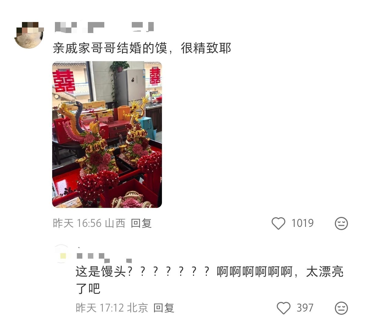 开眼了!碳水大省山西的婚礼上,还有专人管馍馍,这些馍馍太精致了!!!所以谁说咱们中国没有好的甜品师傅?这些做馍的师傅好牛[good]
