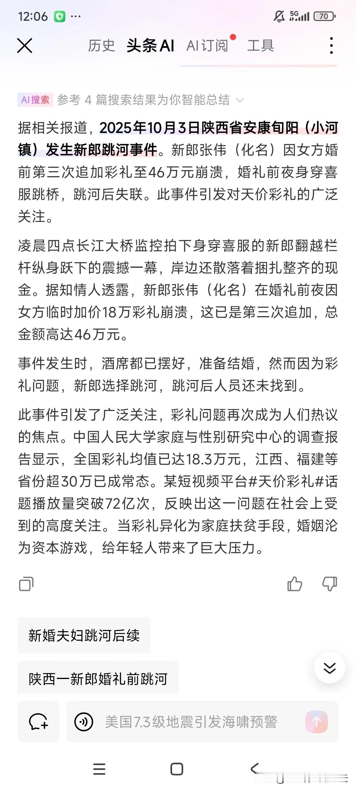 心痛! 喜事瞬间变丧事! 陕西安康市新郎第二天就要在酒店举行婚礼酒席了,就在肖一天晚上凌晨4点多跳桥去了。原因是女方又一次大幅度追加彩礼,这已经是第三次了,前两次追加已经答应了女方,这次是第三次追加18万元彩礼共计46万元。 然而,新郎忍受到了极限,也让他的家庭处在崩溃边缘,只要独自一人跳桥去了,留下独自悲痛欲绝的家人,而女方无疑是“杀人凶手”! 这几年高价彩礼频频被人们所诟病,特别是在欠发达地区尤为严重。希望国家尽快出台律法严控这类畸形的高价彩礼现象吧