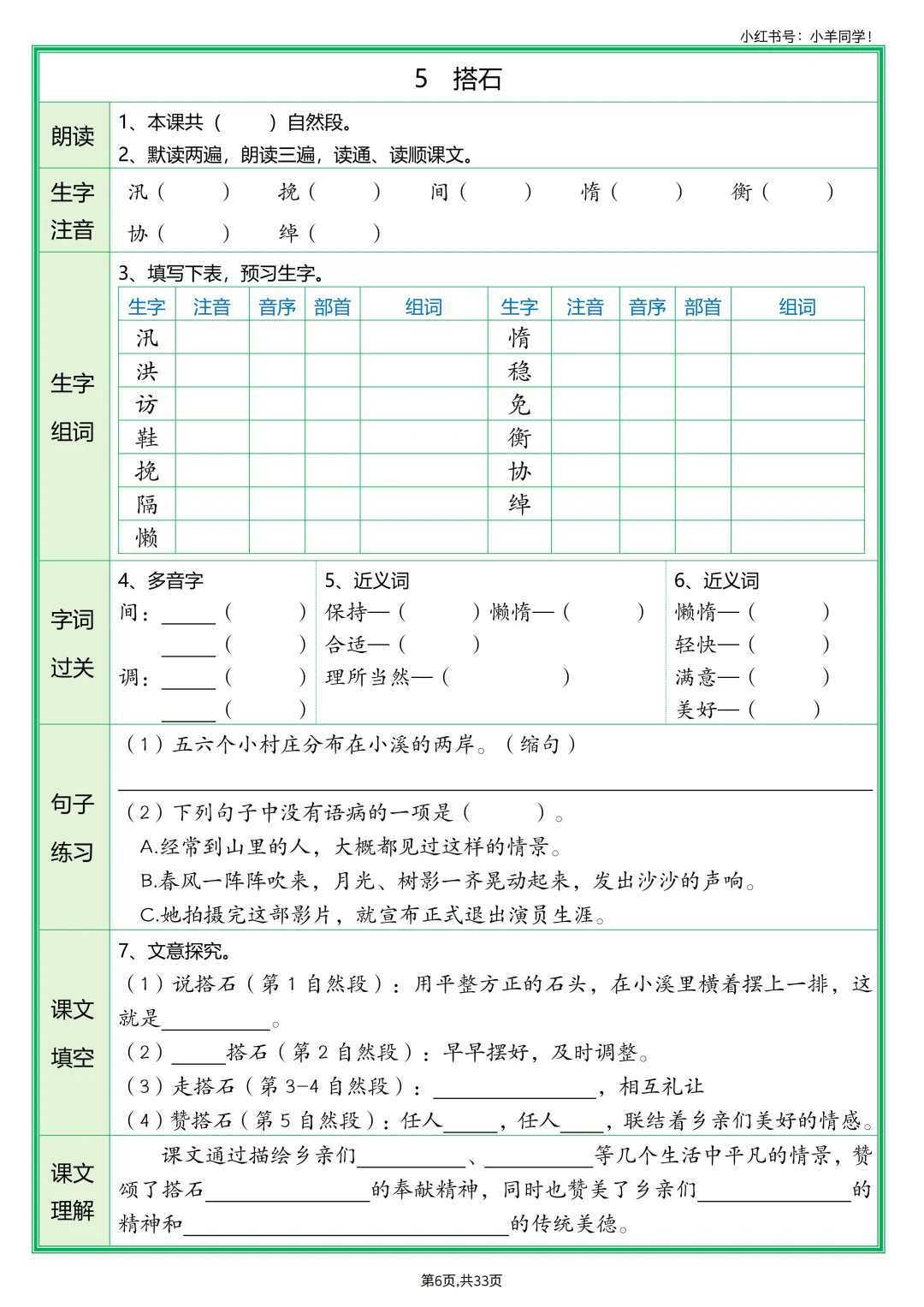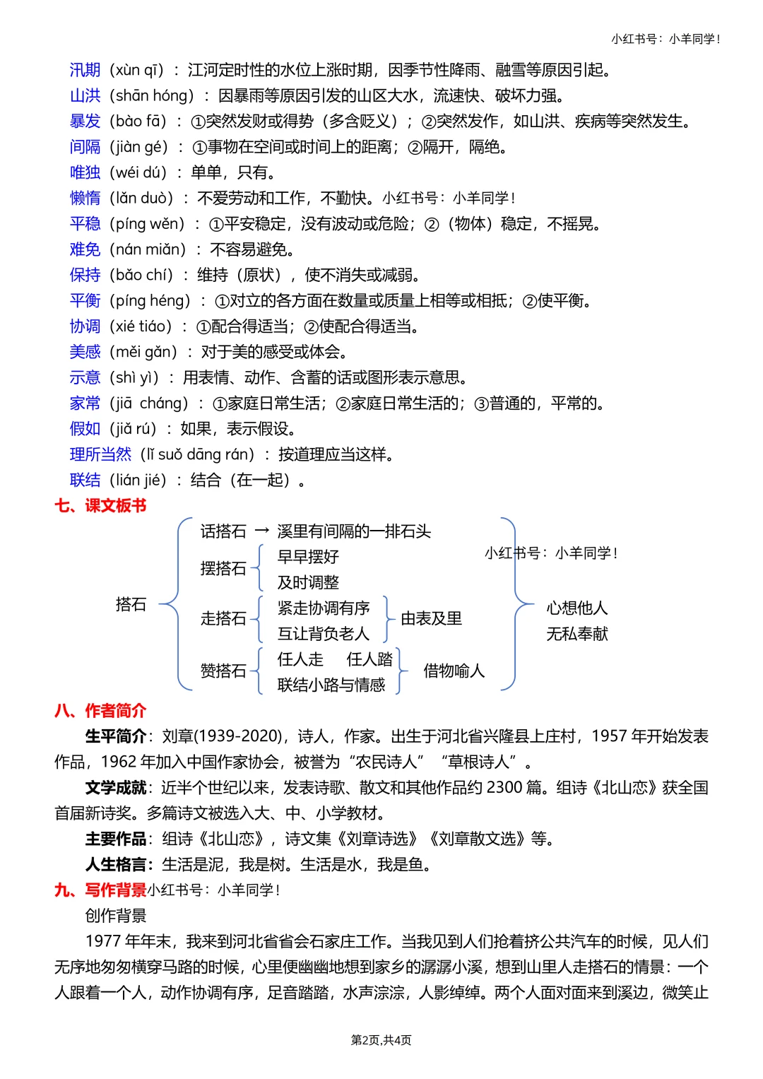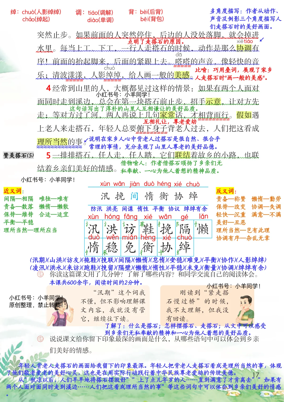 ✅学习目标: 🚩认识“汛、挽”等7个生字,读准多音字“间”,会写“汛、洪”等13个字,会写“汛期、山洪”等词语。 🚩用较快的速度默读课文,能集中注意力,不要回读,了解课文的主要内容。(重点) 🚩品味描写“走搭石”的语言,学习作者从多个角度描写人们走搭石的美。 🚩品读作者细致描写的典型事例,抓住关键词句,感受乡亲们默默无闻、无私奉献的精神。 ⚠️原创整理,禁止转载发布网络平台或商用。