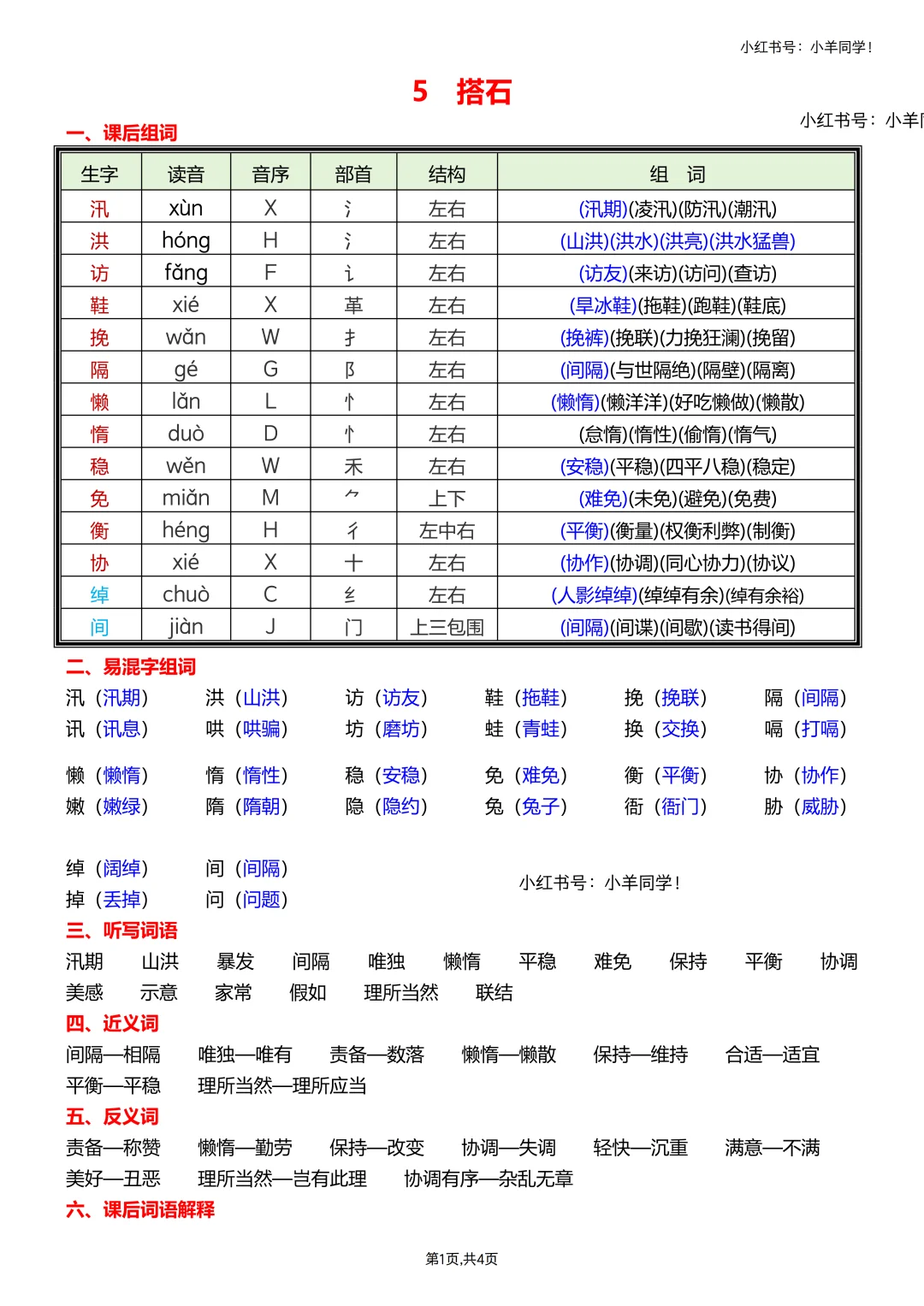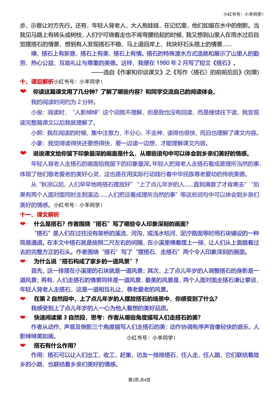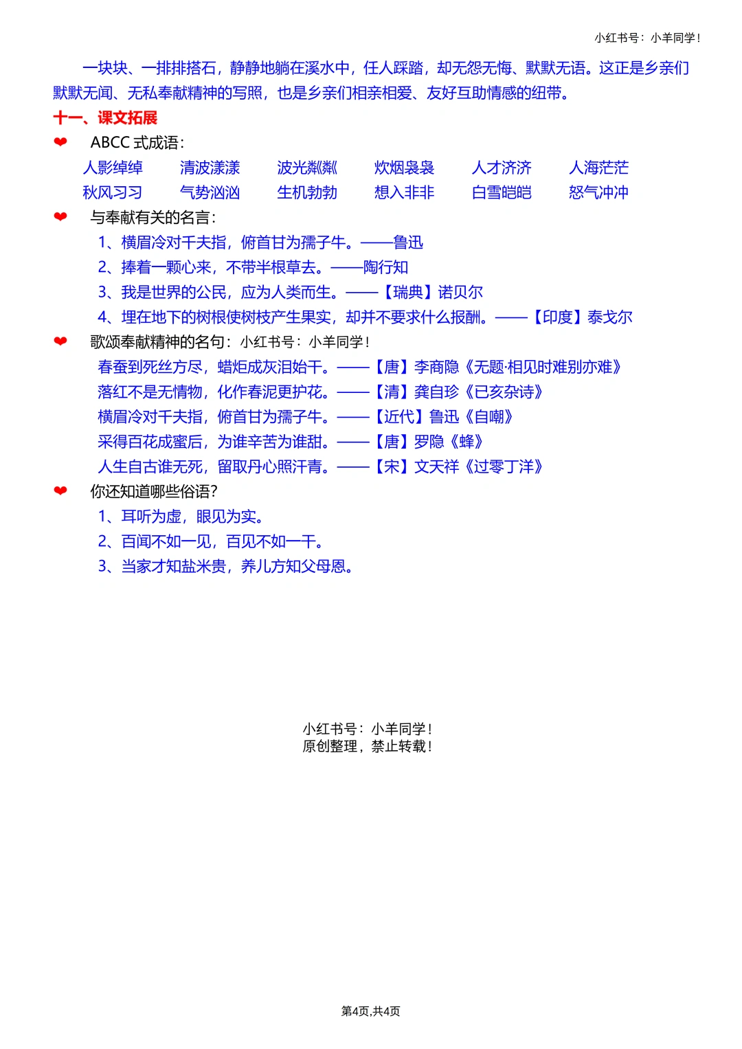 ✅学习目标: 🚩认识“汛、挽”等7个生字,读准多音字“间”,会写“汛、洪”等13个字,会写“汛期、山洪”等词语。 🚩用较快的速度默读课文,能集中注意力,不要回读,了解课文的主要内容。(重点) 🚩品味描写“走搭石”的语言,学习作者从多个角度描写人们走搭石的美。 🚩品读作者细致描写的典型事例,抓住关键词句,感受乡亲们默默无闻、无私奉献的精神。 ⚠️原创整理,禁止转载发布网络平台或商用。