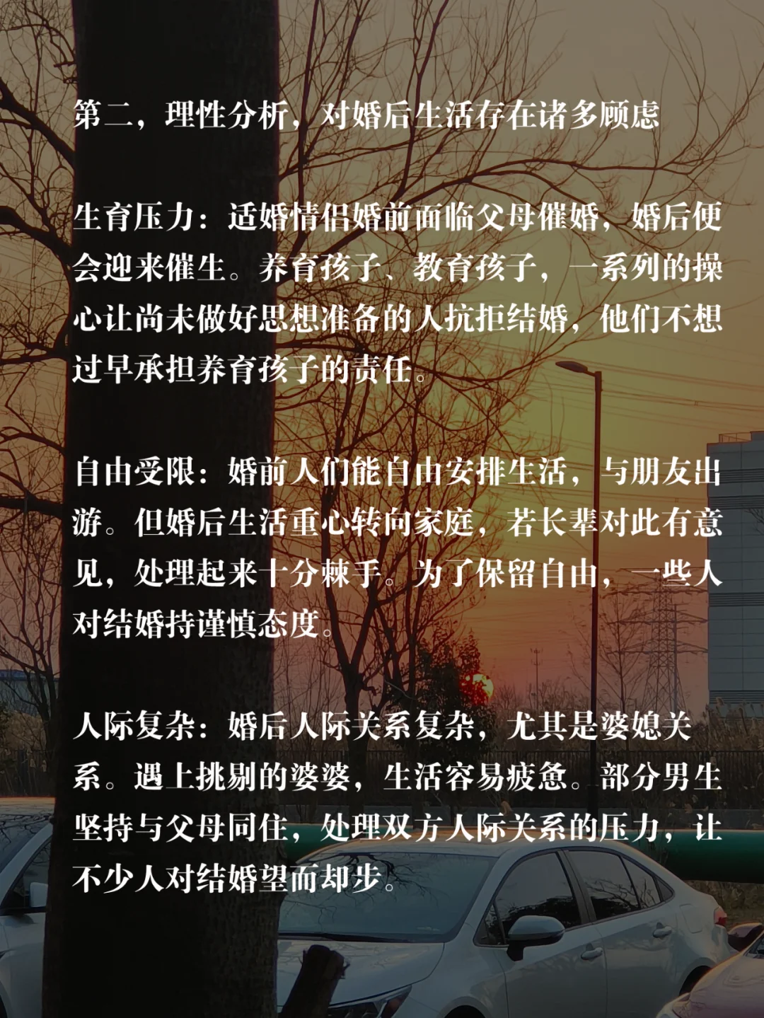 生育压力:适婚情侣婚前面临父母催婚,婚后便会迎来催生。养育孩子、教育孩子,一系列的操心让尚未做好思想准备的人抗拒结婚,他们不想过早承担养育孩子的责任。