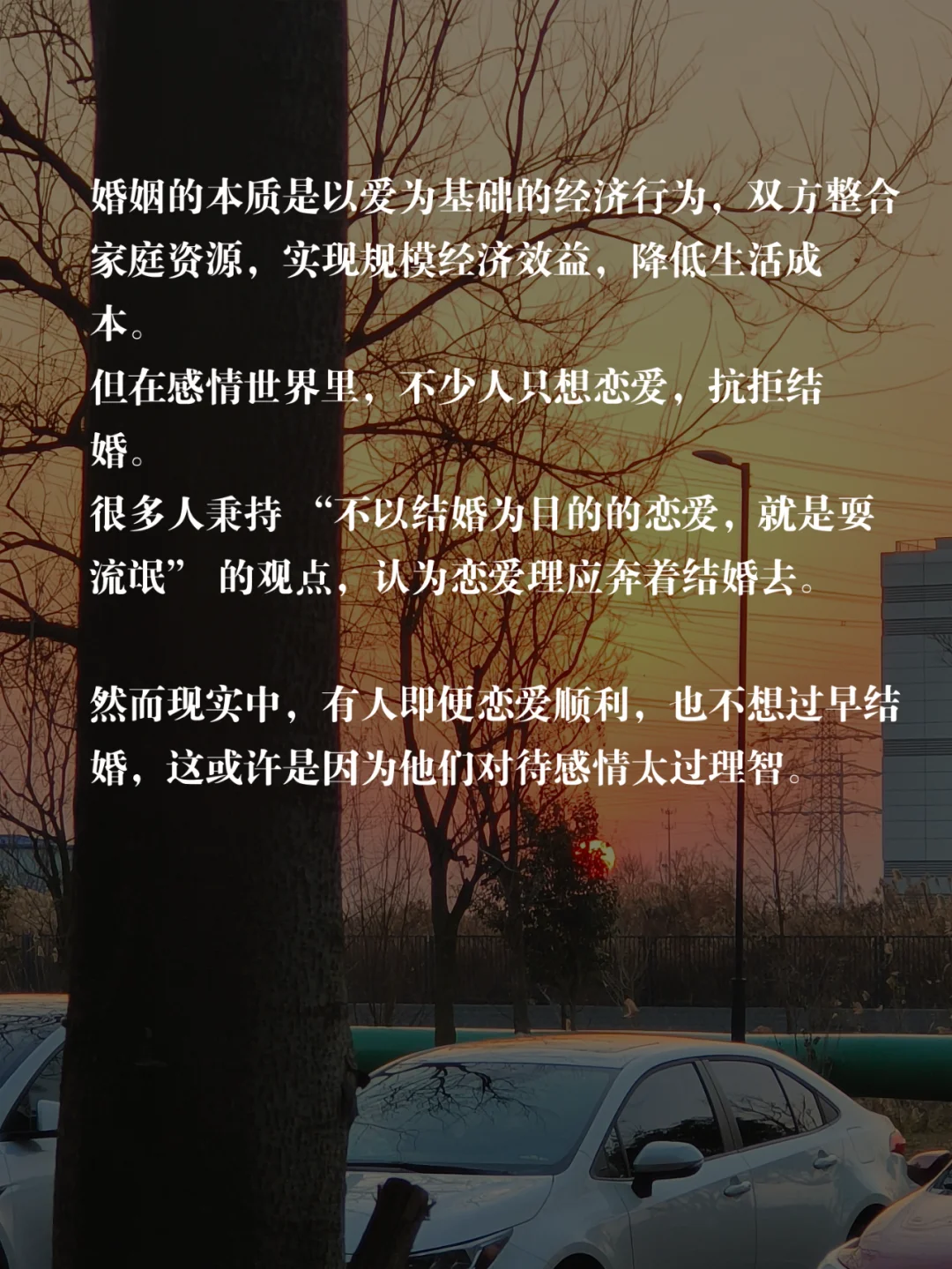 婚姻的本质是以爱为基础的经济行为,双方整合家庭资源,实现规模经济效益,降低生活成本。但在感情世界里,不少人只想恋爱,抗拒结婚。很多人秉持 “不以结婚为目的的恋爱,就是耍流氓” 的观点,认为恋爱理应奔着结婚去。然而现实中,有人即便恋爱顺利,也不想过早结婚,这或许是因为他们对待感情太过理智。