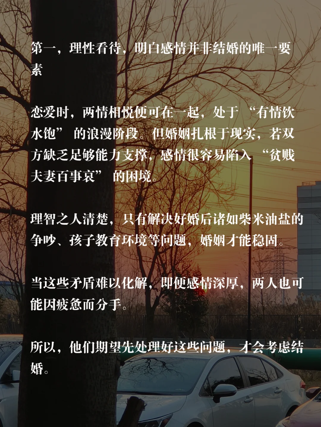恋爱时,两情相悦便可在一起,处于 “有情饮水饱” 的浪漫阶段。但婚姻扎根于现实,若双方缺乏足够能力支撑,感情很容易陷入 “贫贱夫妻百事哀” 的困境。理智之人清楚,只有解决好婚后诸如柴米油盐的争吵、孩子教育环境等问题,婚姻才能稳固。当这些矛盾难以化解,即便感情深厚,两人也可能因疲惫而分手。所以,他们期望先处理好这些问题,才会考虑结婚。