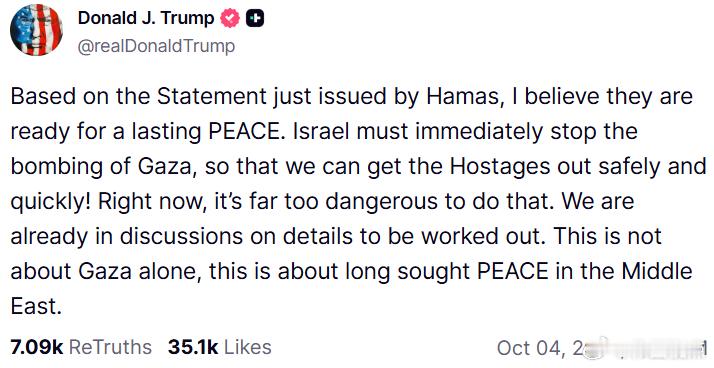 根据哈马斯刚刚发表的声明,我相信他们已经准备好实现持久的和平。以色列必须立即停止轰炸加沙,这样我们才能安全、迅速地把人质解救出来!眼下,要做到这一点实在太危险了。我们已经在就相关细节进行讨论。这不仅仅关乎加沙,而是关乎中东长期以来渴望的和平。