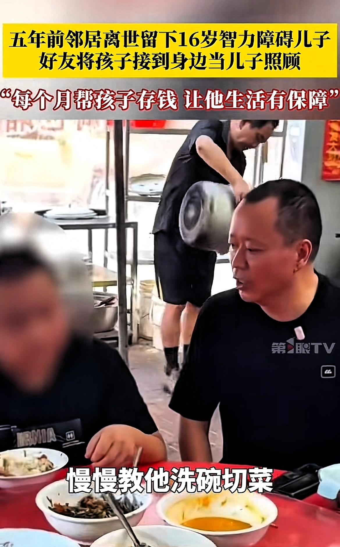 重情重义! 只要我有一口饭吃, 就不会让他饿着! 五年前,湖南老杨,在病床前对挚友许下这句承诺时,怀里搂着的是挚友16岁,却只有四五岁心智的儿子。 如今孩子已经21岁,不仅学会了洗碗切菜,自己煮面,更学会了用温暖的笑容迎接每一位客人。 这场跨越血缘的守护,让我看到了承诺最重的分量。 老杨把智力障碍的小熊带回家,从穿衣洗漱开始手把手地教。 有人说他傻,接手这样的“累赘”, 可他却说:答应了兄弟的事,这辈子都得算数! 五年时光,1800多个日夜, 老杨在自家小餐馆里,耐心重复着每一个动作。 当小熊第一次,独立端出一碗热腾腾的面条时,这个硬汉眼眶湿了。 这不是简单的照顾,而是一个生命对另一个生命的全然托付。 在这个人人自保的时代,总有人用最朴素的行动诠释着“情义”二字。 老杨每月给小熊存钱,盘算着未来,超越血缘的父子情,温暖得让人动容 你身边也有这样重情重义的人吗? 欢迎在评论区分享温暖的故事。 信息来源:第一眼新闻