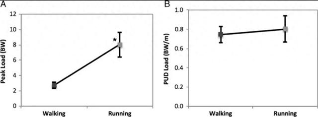 首先可以肯定的是,在跑步时膝关节会承受的最大冲击力确实比走路时候更高。比如,2014年的一项研究就发现,在跑步时候,膝盖所承受的峰值冲击力最大可以达到8.02倍体重,而相比之下,走路时候膝盖承受的峰值冲击力最大是2.72倍体重。跑步时候膝盖要承受的峰值冲击力几乎是走路时候的3倍(如下图左侧图所示)。