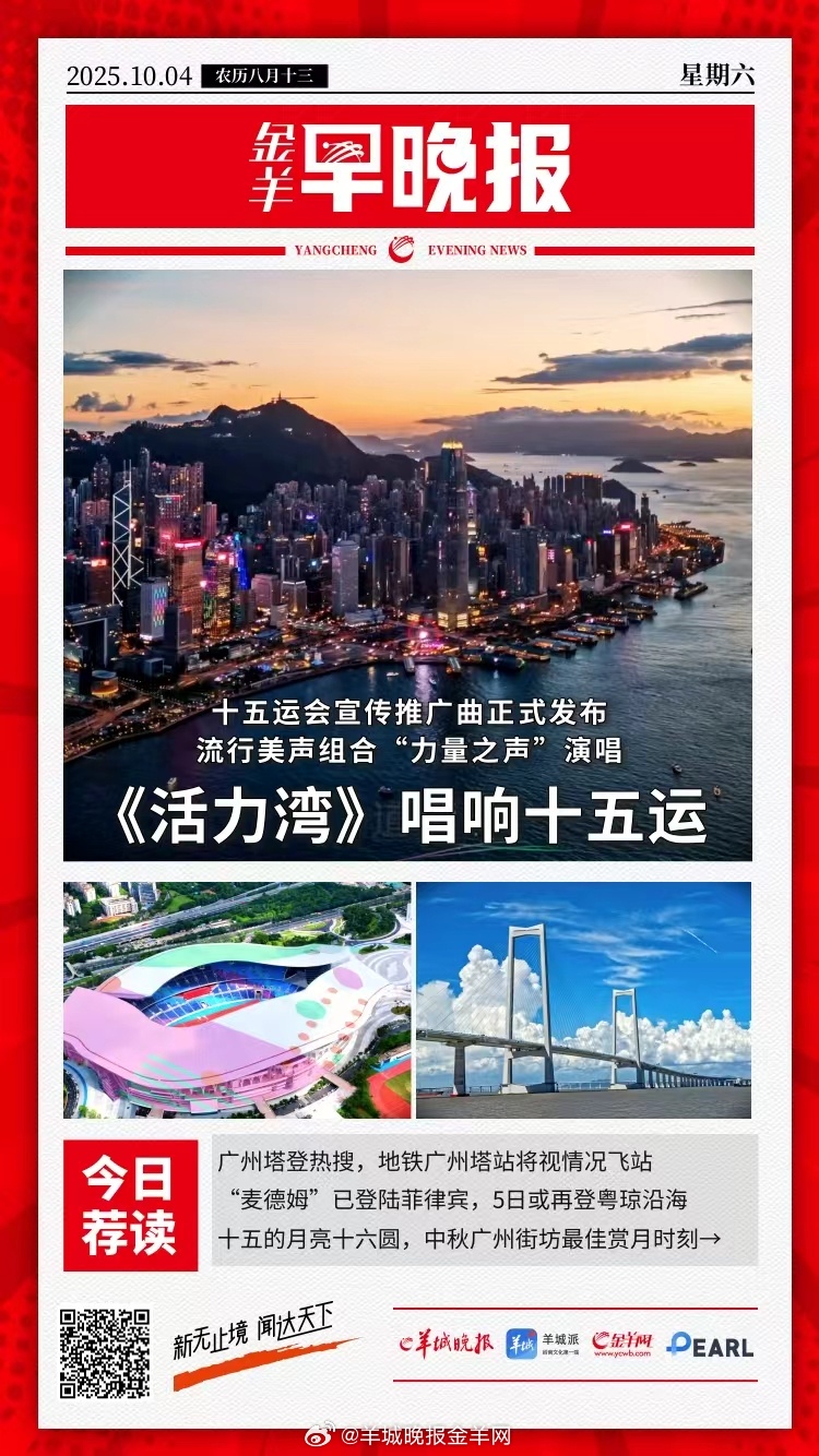 #金羊早晚报# 广东:多措并举育才引才,真情实意爱才用才 第十五届全国运动会《活力湾》宣传推广曲正式发布 粉丝看周杰伦演唱会丢失价值11万元手镯,她发了个帖,第二天奇迹来了 十五的月亮十六圆+超级月亮!中秋广州街坊最佳赏月时刻→ “人人人人广州塔人人人人”登上热搜!地铁广州塔站将视情况飞站 游本昌坦言“像是得了抑郁症”,原因竟是不愿与“爷叔”告别 张学友“60+”演唱会12月红馆举行最终场,陪伴歌迷跨年 杨瀚森全力融入开拓者备战新赛季,笑称会主动把翻译“踢”走 墨西哥近日连续对我发起多起反倾销调查,商务部回应 欲突破以色列封锁 又一支船队正驶向加沙地带 威廉王子首次公开谈论凯特王妃患癌:重要的是互相陪伴,让孩子们放心 更多精彩报道,请扫码关注羊晚全媒体报道! #月满中秋共迎盛会##小米公司发言人回应##主办方否认引发争议的是梓渝#
