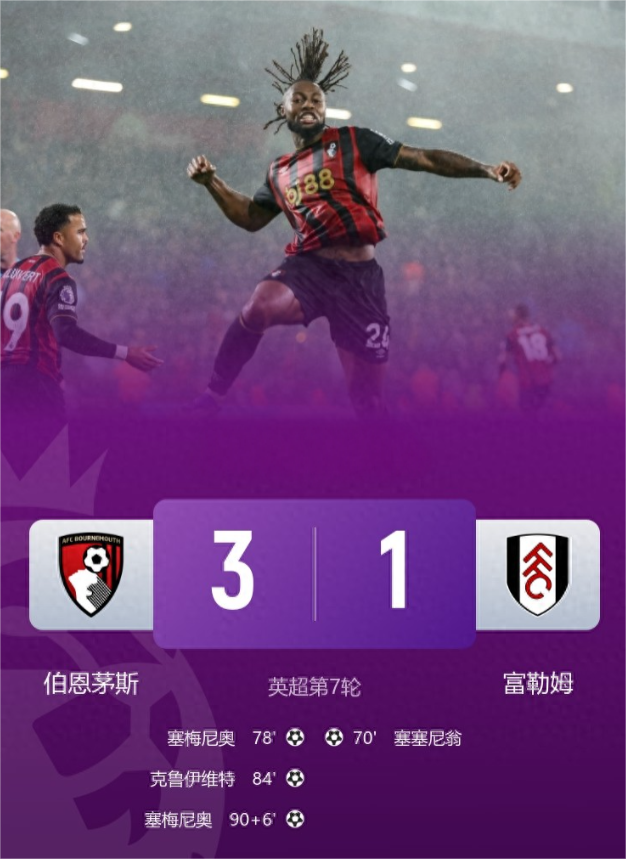 英超第7轮伯恩茅斯vs富勒姆!上半场,双方均无建树。下半场,丘库埃泽助攻塞塞尼翁打破僵局!随后塞梅尼奥上演精彩一条龙破门!小克鲁伊维特远射反超!最终,伯恩茅斯主场3-1逆转富勒姆,英超6轮不败!