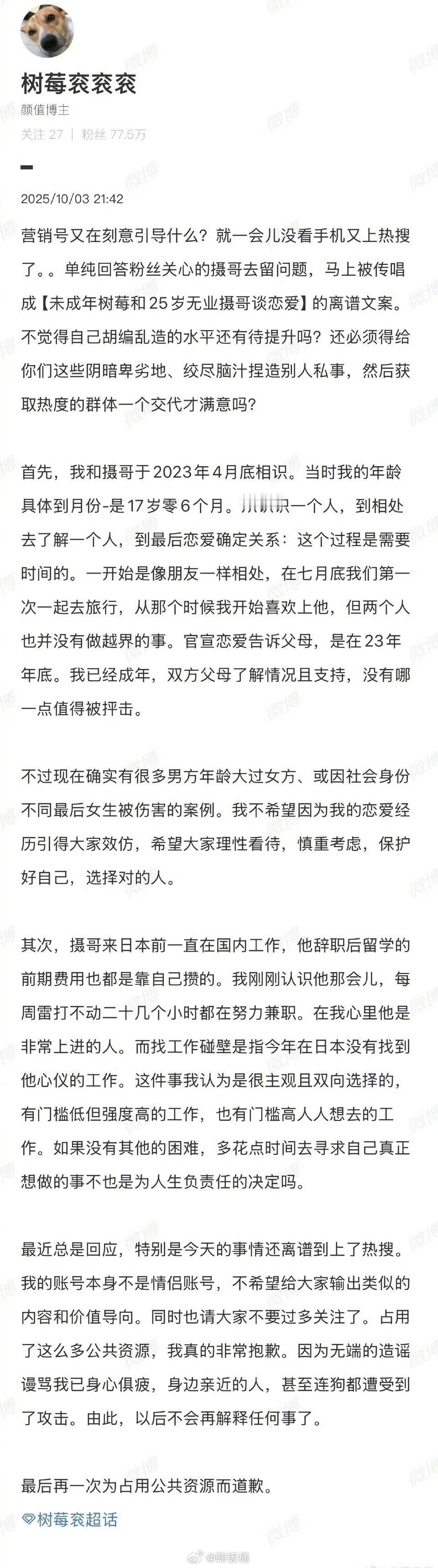 树莓发文回应,和摄哥恋爱时已成年