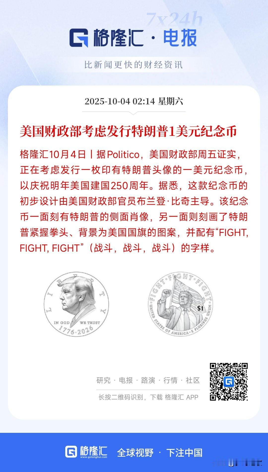 离了个大谱了,美元上面可能会出现特朗普的头像了 美财政部正在考虑把1美元的硬币上面印上特朗普的头像,背面是战斗的图像。 目前美元上面的头像 1美元纸币:华盛顿,美国“国父”,领导大陆军打赢独立战争,确立美国主权; 5美元纸币:林肯,领导北方打赢南北战争,维护美国国家统一;颁布《解放黑人奴隶宣言》,废除奴隶制 10美元纸币:汉密尔顿,美国首任财政部长,设计美国早期财政金融体系(如建立国家银行、统一货币),是美元霸权的奠基者 100美元纸币:富兰克林,美国建国的“开国元勋”之一,核心贡献是作为外交核心推动法国承认美国独立,为独立战争胜利争取到关键外援;同时参与起草《独立宣言》和美国宪法 不知道特朗普会以什么功绩把头像印在货币上面,总不能说特朗普发动了关税战,阻止了中东战争吧,好像这些都不是功绩。