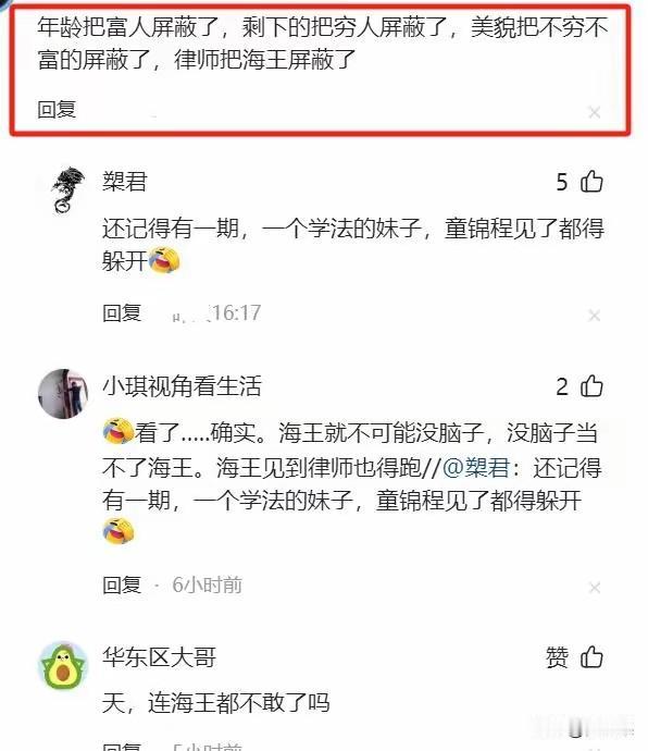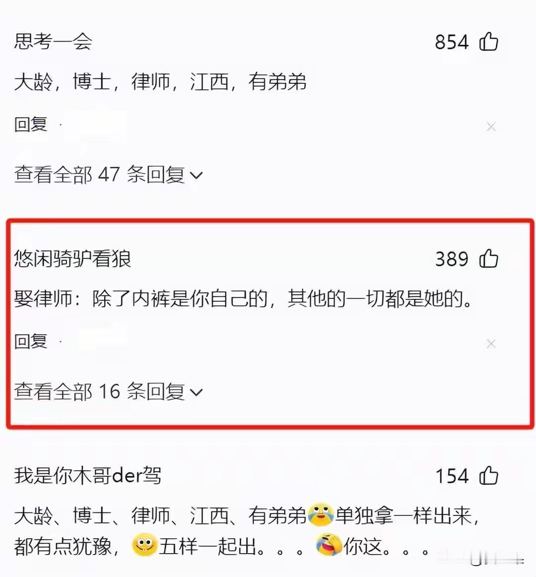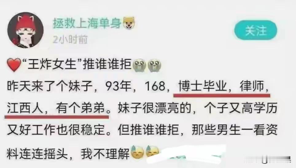 一场真挚的爱情摆在你面前,你会退缩吗? 我发现,不但有人退缩,好多人都选择了退缩,这让我大为震惊。 江西一位女博士,长得好,工作好,就是找不到对象。 看看她的条件:今年32岁,168的个子,长得漂亮,是个律师,有个弟弟。 有男士想跟她谈对象,但是一说走进婚姻就打退堂鼓了。 有人还戏谑:海王都得绕道走。我不知道什么是海王,只是觉着条件这么好还有人不识货? 不,是大家太识货了,有人分析,她的工作和博士学位代表着高收入,这在相亲市场是受欢迎的,但是不要忘了,她是法学博士,这个身份注定要在婚后被她拿捏,到时候她的仍是她的,你的还是她的。期间,你和她还要对她的弟弟行帮扶之意。 最后的结果也是竹篮打水一场空。 人生短暂,何必趟这趟浑水? 我越看越笑,那是不是口袋空空一无所有的男的可以跟她谈,可是女方肯定不愿意。 所以,僵局就形成了,这样的优质女找不到对象。 混到现在,女律师没有市场了。 我一个同学在西安,干律师十几年了,始终单身。同学会上,我曾经问她为什么不找,她只是嘿嘿一笑。 现在回想起来尴尬无比。 对比条件这么优质的女孩儿,农村那些顶多高中毕业,出去打个工,回家相亲的就络绎不绝。 所以,我想问城市里的男士,假如两个女孩儿,同样模样好,一个高学历律师,一个高中毕业打工,相亲你会选谁? 就算拒绝了女律师,也不见得能相中打工女孩儿吧? 那么相亲市场到底是看中啥?遇到哪哪条件都合适的很难,因为世上没有完美,只有遗憾。