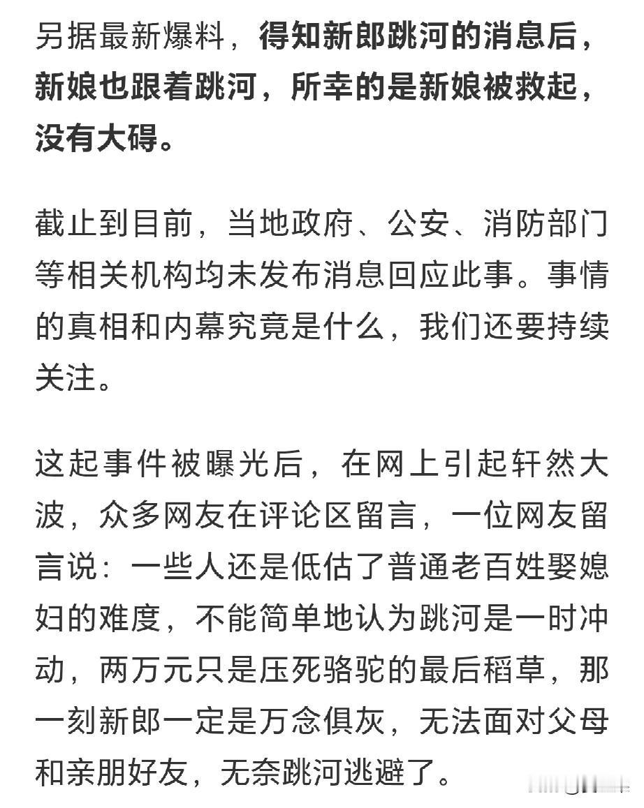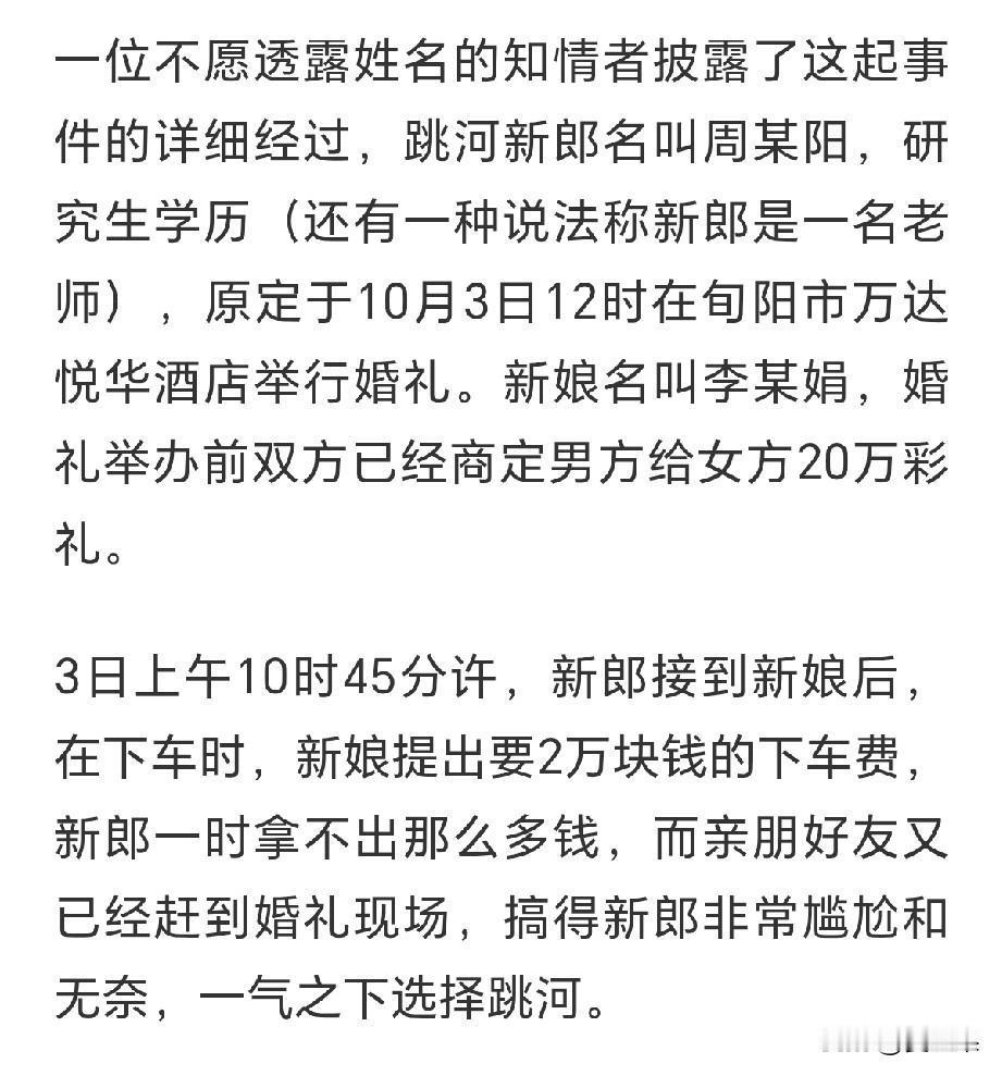 中午12点举行婚礼, 新郎11点跳河自杀了,这场本不该发生的悲剧就发生在陕西旬阳。 悲剧原因还是因为彩礼,因为临门一脚的彩礼。 10月3日,农历八月十二,也是结婚的好日子。当天上午,新郎一行前去接新娘,一起到预订的酒店举行仪式。临下车时,新娘一方要求再拿2万块钱的下车礼。 新郎一行没有准备,因为之前谈好了20万彩礼,没有说下车礼。 双方就僵持着,新郎眼看宾朋已到,可能感觉面子挂不住,一时想不开,就跑向附近大桥上,跳了下去。 当天河面水流湍急,新郎一跳下去就不见了,亲朋好友连紧急打捞的机会都没有。 新娘看到这一幕,可能惊呆了,转念一想,又是自己惹起的,也想不开想跳河,所幸被大家拉住了。 在很多地方临门一脚加彩礼的事是屡见不鲜的。有人说之前双方不商量好,临时要下车费谁会准备? 还真别说,就算之前没有商量,男方家还得预备着下车礼。在我老家好像这是约定俗成。比如我家小叔子结婚,当天去接新娘的路上,就接到电话让准备下车礼,不然一会儿去了不下车,我婆婆知道后就忙说,已经准备好了,至于多少,娘家人可以问问,如果嫌少,还得加。 不过我赞成婚礼前双方都商量好,这样男方也好做准备,在那么多亲朋好友面前,也不至于失了双方的颜面。 最后听说,当天晚上才打捞出新郎遗体,婚礼变丧礼,男女两家有可能会结下仇怨。 听说这个新郎小伙子还是个研究生,唉,有文化有知识的孩子却被这婚姻陋习困住了,实在不该。真是太可惜了。